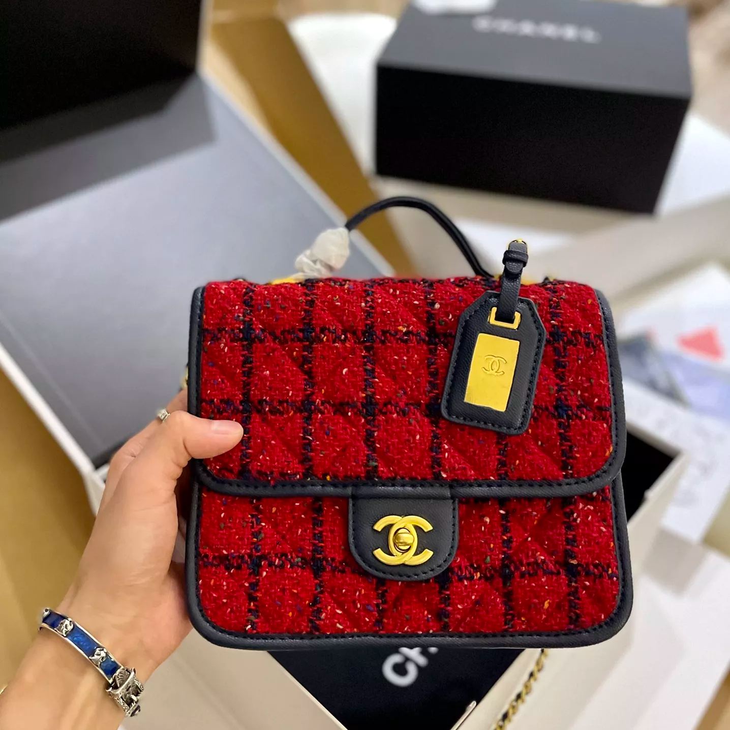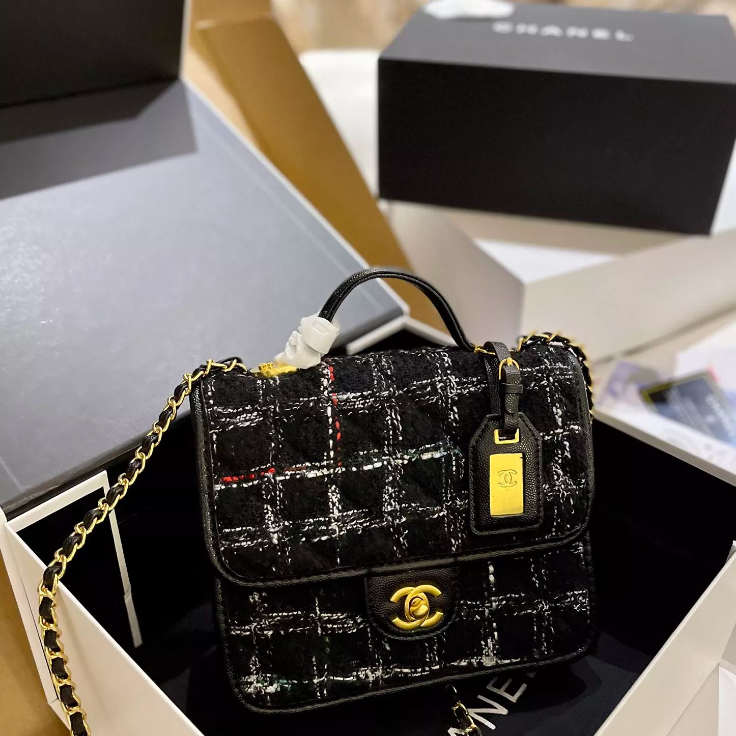 ツイードがおしゃれなシャネルのハンドバッグです。