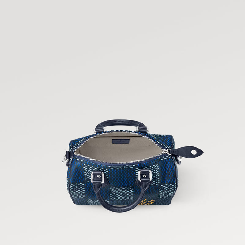 • ファレル・ウィリアムスならではの新素材のダミエ・ヘリテージ キャンバスでトレンディな雰囲気にアップデートした「スピーディ・バンドリエール 25」。市松模様のレトロな表情とメゾン初期の旅行鞄を彷彿させる「Marque L.Vuitton Déposée」シグネチャーが魅力。2本のトップハンドルと取外し & 調節可能なストラップでさまざまな持ち方を楽しめます。