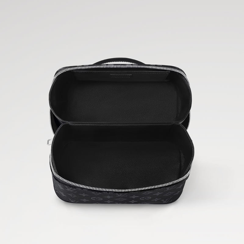 モノグラム・エクスリプス キャンバスを使用したトラベルポーチ、「トイレタリー・バッグ」。大ぶりな開口部と内側のマチにより内部に2つの独立したコンパートメントを備えた、身だしなみの必需品を持ち運ぶのにぴったりのアイテムです。ダブルファスナースタイルの開閉と水拭きできるライニングを施し、この上なく機能的に仕上げました。快適に持ち運べるトップハンドル付き。