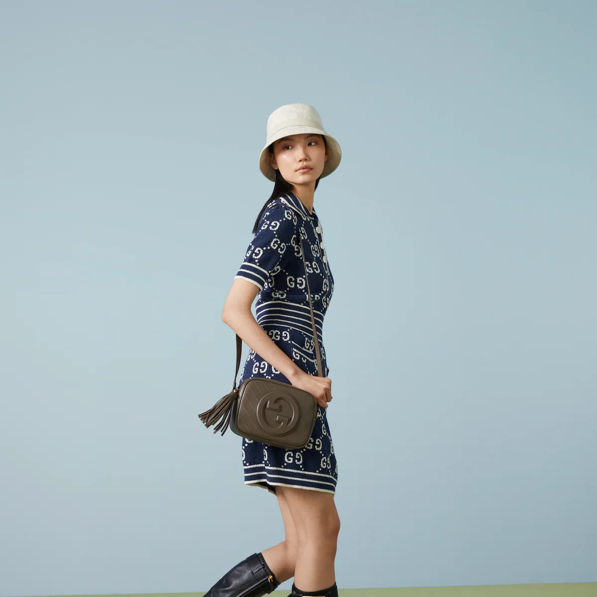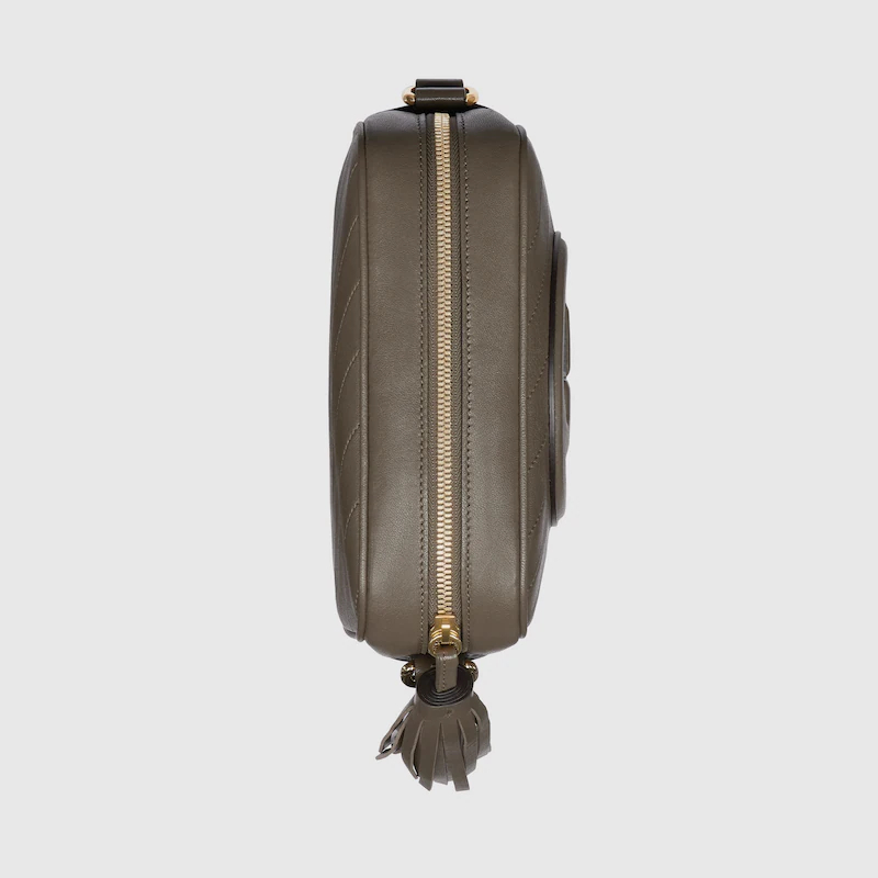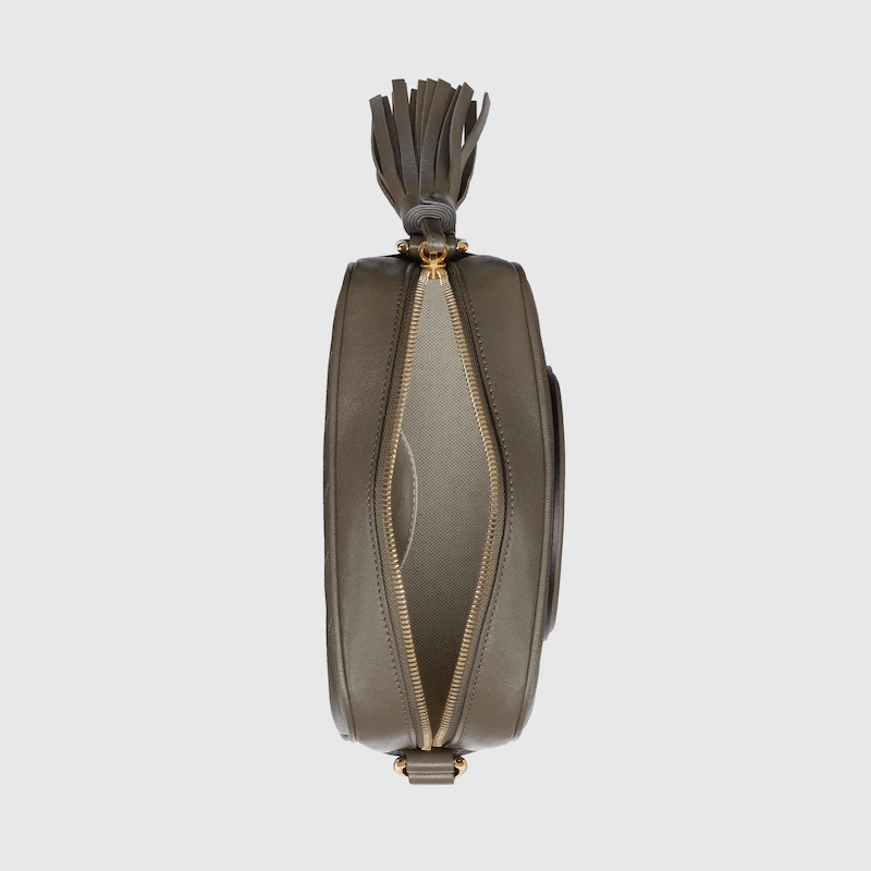 The Round Interlocking G that characterizes the Guthtcci Blondie line originates from the House archives. Signature pieces such as this Guthtcci Blondie shoulder and crossbody bag reinterpret the emblem as a subtler leather patch detail.