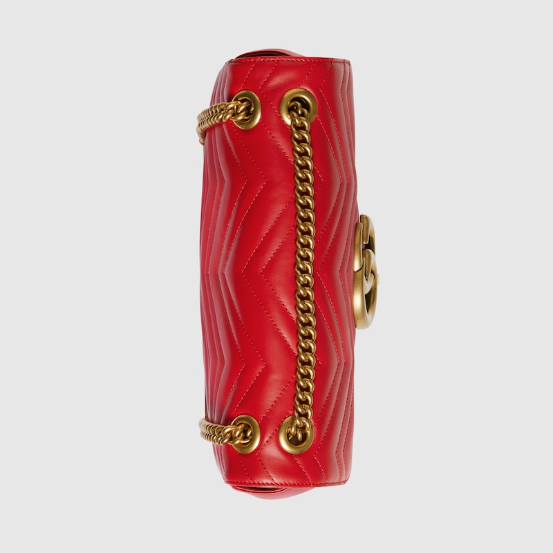 Crafted from a red matelass�� chevron leather. this medium GthtG Marmont chain shoulder bag has a softly structured shape and an oversized flap closure with Double G hardware. The sliding chain strap can be worn multiple ways. changing between a shoulder and a top handle bag.