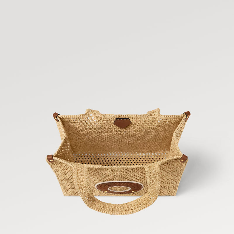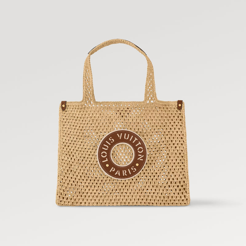 • 天然のラフィア(ヤシ)を手作業で編み上げた「LV バイ・ザ・プール」コレクションの1つ「オンザゴー MM」。カウハイドレザーを使用したコーナー部分にはビス(鋲)を添え、フロントには円型の「Louis Vuitton Paris」パッチをあしらいました。13インチのノートパソコンやビーチタオルに加え、普段の必需品を収納できるのも魅力。