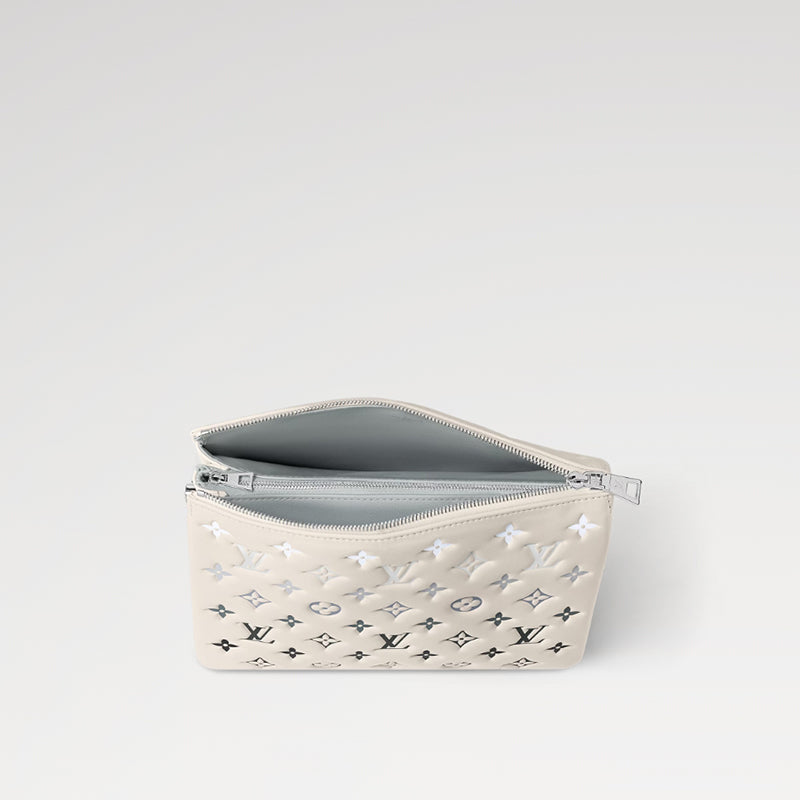 • 山への小旅行はもちろん、それ以外の場所でも活躍する「LV SKI」コレクションの最新バージョンの「クッサン PM」。ラムレザーにユニークなグラデ―ション仕上げで、メゾンを象徴するモノグラムをエンボス加工で施し、ガルバナイズド加工したバイカラーのチェーンで飾りました。財布やスマートフォン、口紅などの必需品を収納するのにぴったりな今シーズンのキーシェイプです。