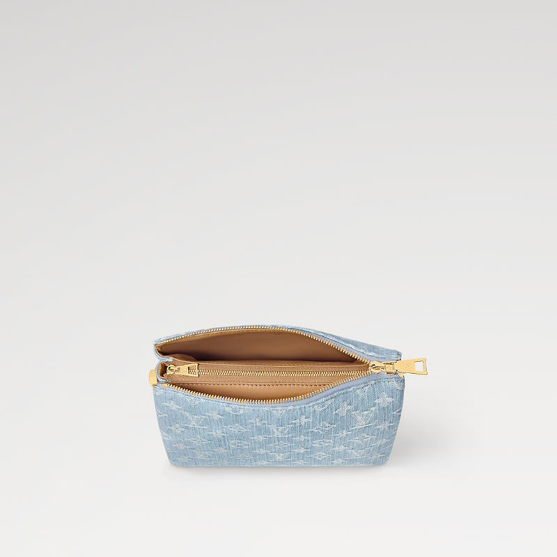 このCoussin BBハンドバッグは100%コットンデニムで作られており、モノグラムデニムの楽しい夏の雰囲気を強調しています。このユニークな生地を作る際には、まずモノグラム柄を生地に織り込み、その後すすぎ、ストーンウォッシュします。太めのチェーンストラップと汎用性の高いレザーショルダーストラップが付属しており、どちらも取り外し可能です。