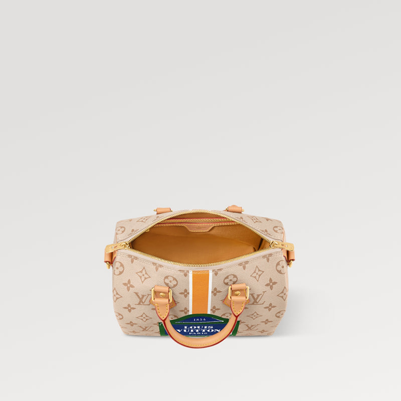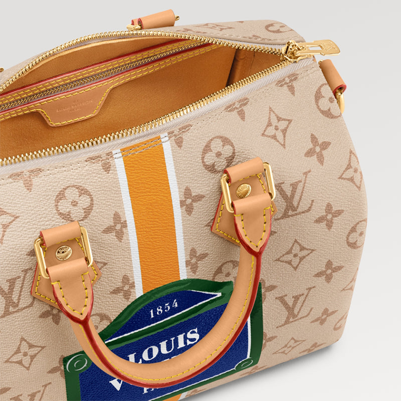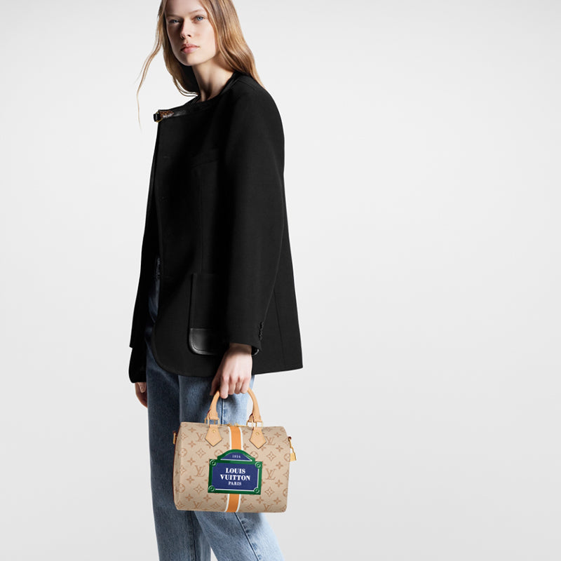 • このスピーディ バンドリエール 25 ハンドバッグは、クラシックな構造を作り出すためにモノパナメ キャンバスで作られており、中央の縦ストライプはブランドのクラシックなハード ボックスの要素を再現しています。大胆な色がルイ・ヴィトン パリのロゴを強調し、象徴的なパリの道路標識を作り出しています。