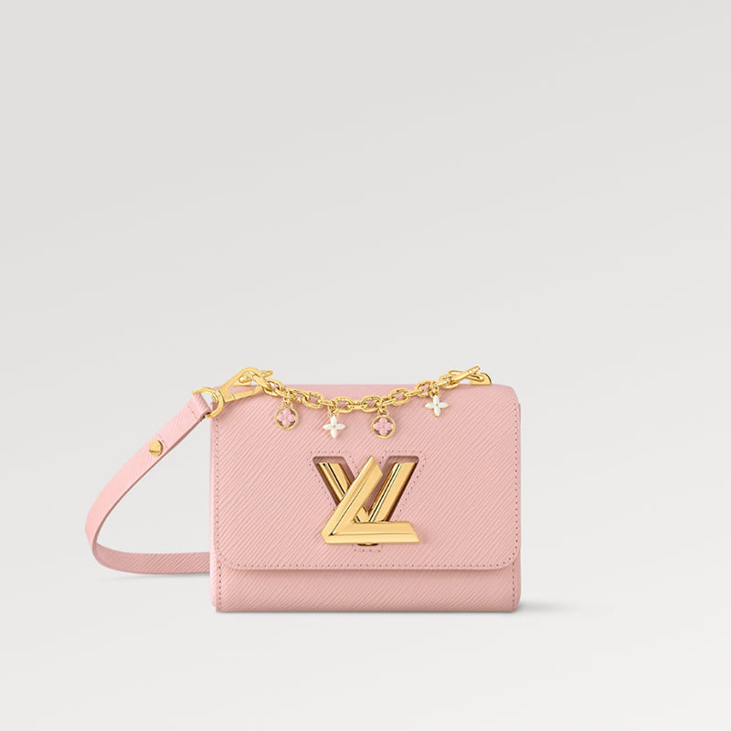 スムースカーフスキントリムを施したエピグレインレザーのツイストスモールバッグは、取り外し可能な装飾チェーンに組み込まれたエナメルとメタリックなモノグラムフラワーが特徴です。取り外し可能で調節可能なショルダーストラップにより、肩掛けまたはクロスボディでの着用が可能です。