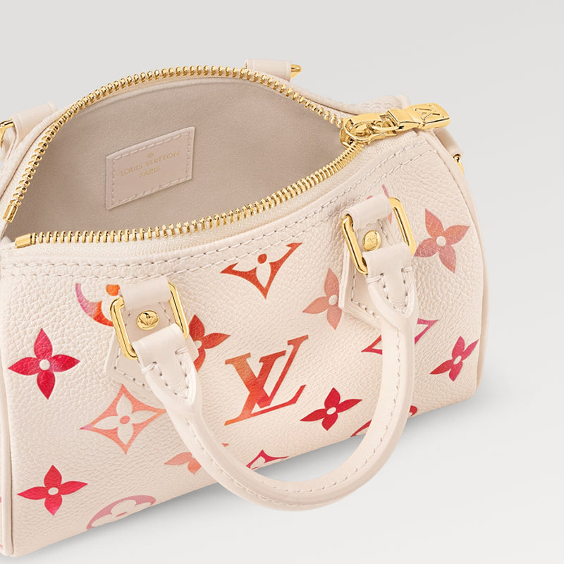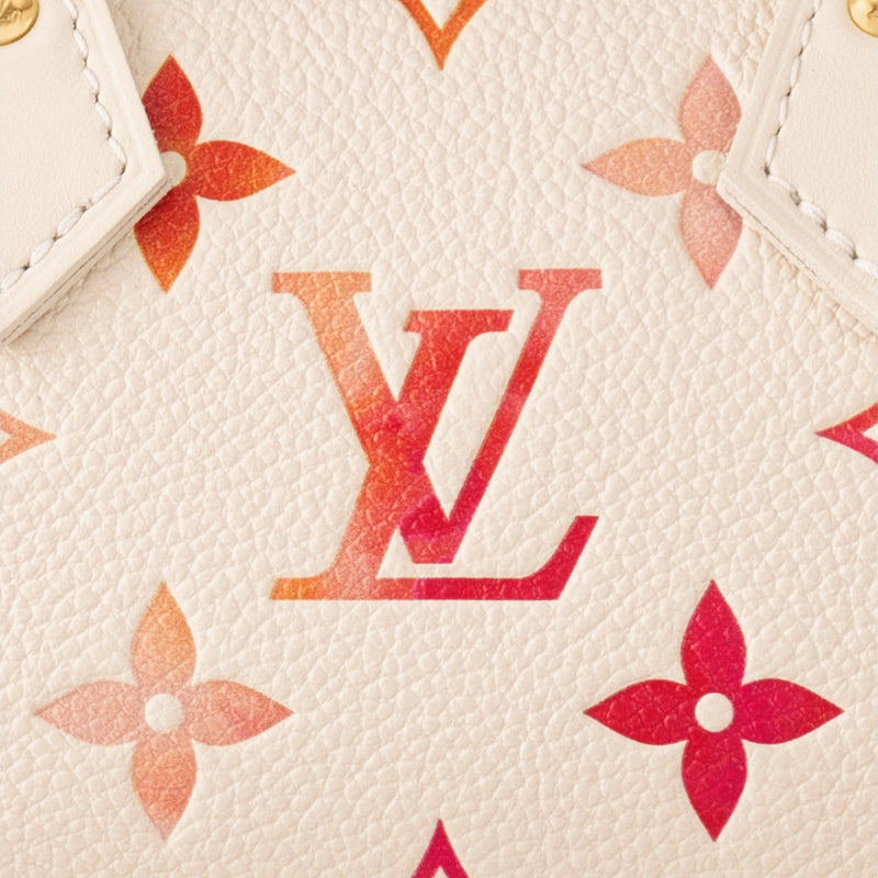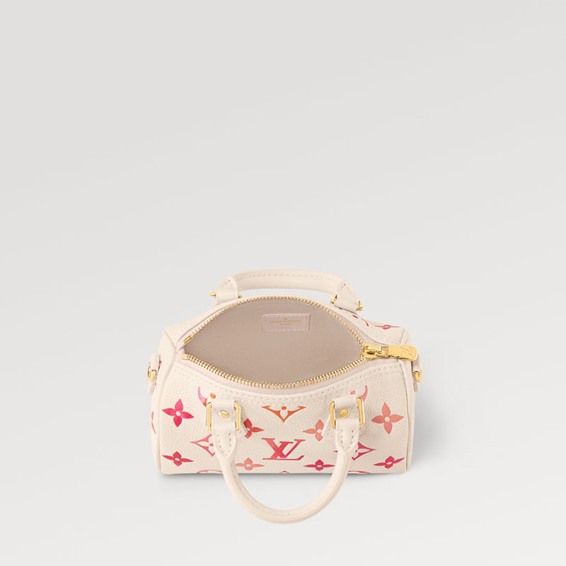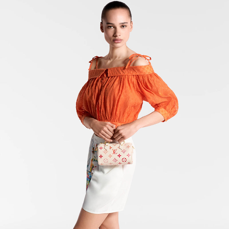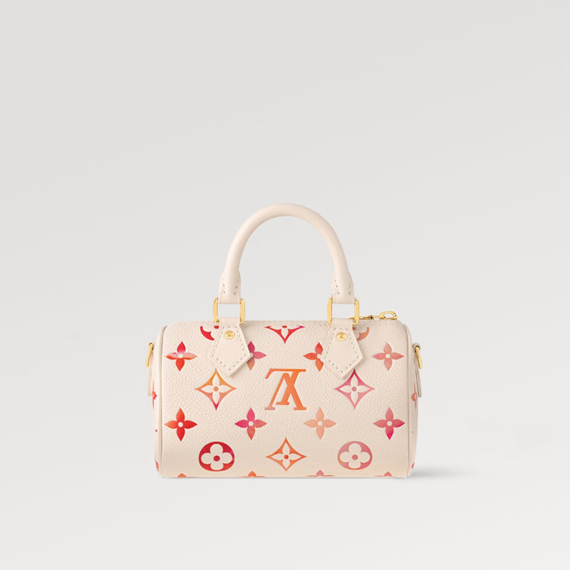 • 「サンライズ・アクワレル」コレクションに登場した「ナノ・スピーディ」。デジタルプリントした日の出を想わせる色合いが、水彩画のような効果を生み出します。アイコニックなバッグ「スピーディ」をミニチュアサイズに再解釈したアイテムは、2本のハンドルと取外し & 調節可能なショルダーストラップ付きで、さまざまな持ち方を楽しめます。