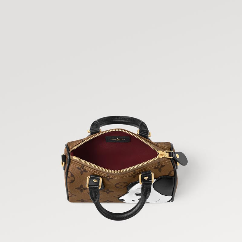 • ルイ・ヴィトンのウィメンズ アーティスティック・ディレクター ニコラ・ジェスキエールと、大量生産されたおもちゃのカラフルな絵画で知られるアーティスト Sun Yitianとのコラボレーションから生まれた、エクスクルーシブな限定版の「ナノ・スピーディ」。モノグラム・リバース キャンバスで仕立て、カーフレザーで愛らしいブラック & ホワイトの犬を模ったパッチをあしらいました。オリジナル作品の背景を彷彿させるレッドのライニングを施し、取外し可能なショルダーストラップを備えた、遊び心溢れるコレクターズアイテムです。