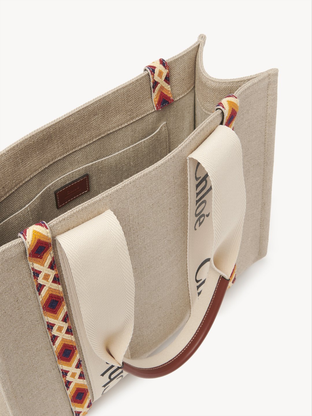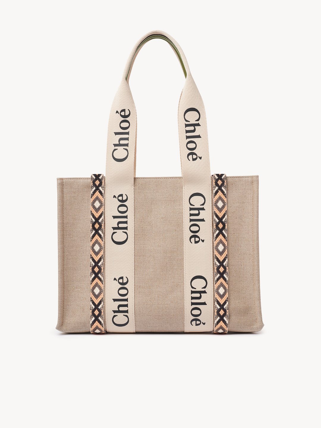 コントラストな縦のレザーの飾り紐とメゾンの“Woody”ミュールと合わせたシグネチャー、Chloéロゴのリボンが、バッグのシャープでモダンなラインを際立たせています。快適にショルダーまたはハンドキャリーできるトートバッグです。