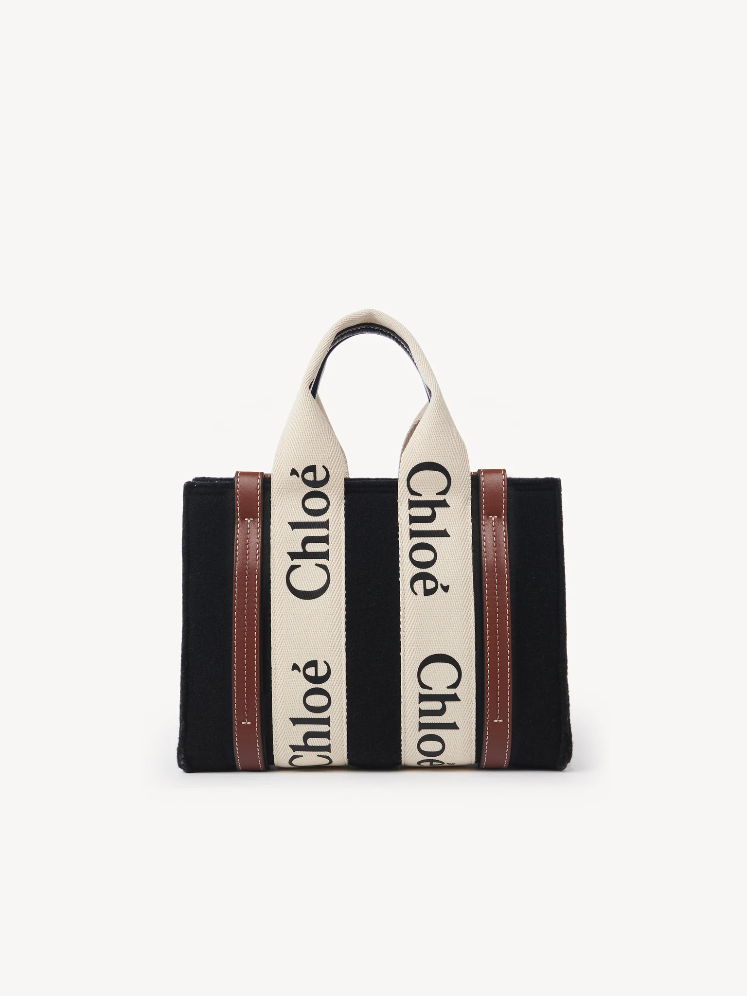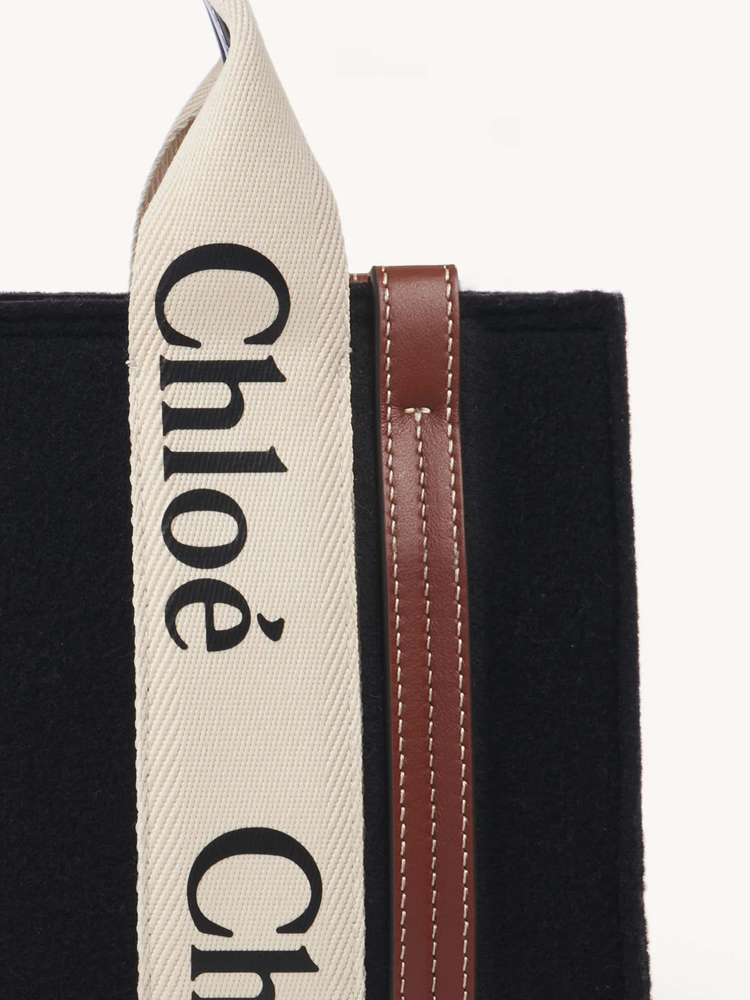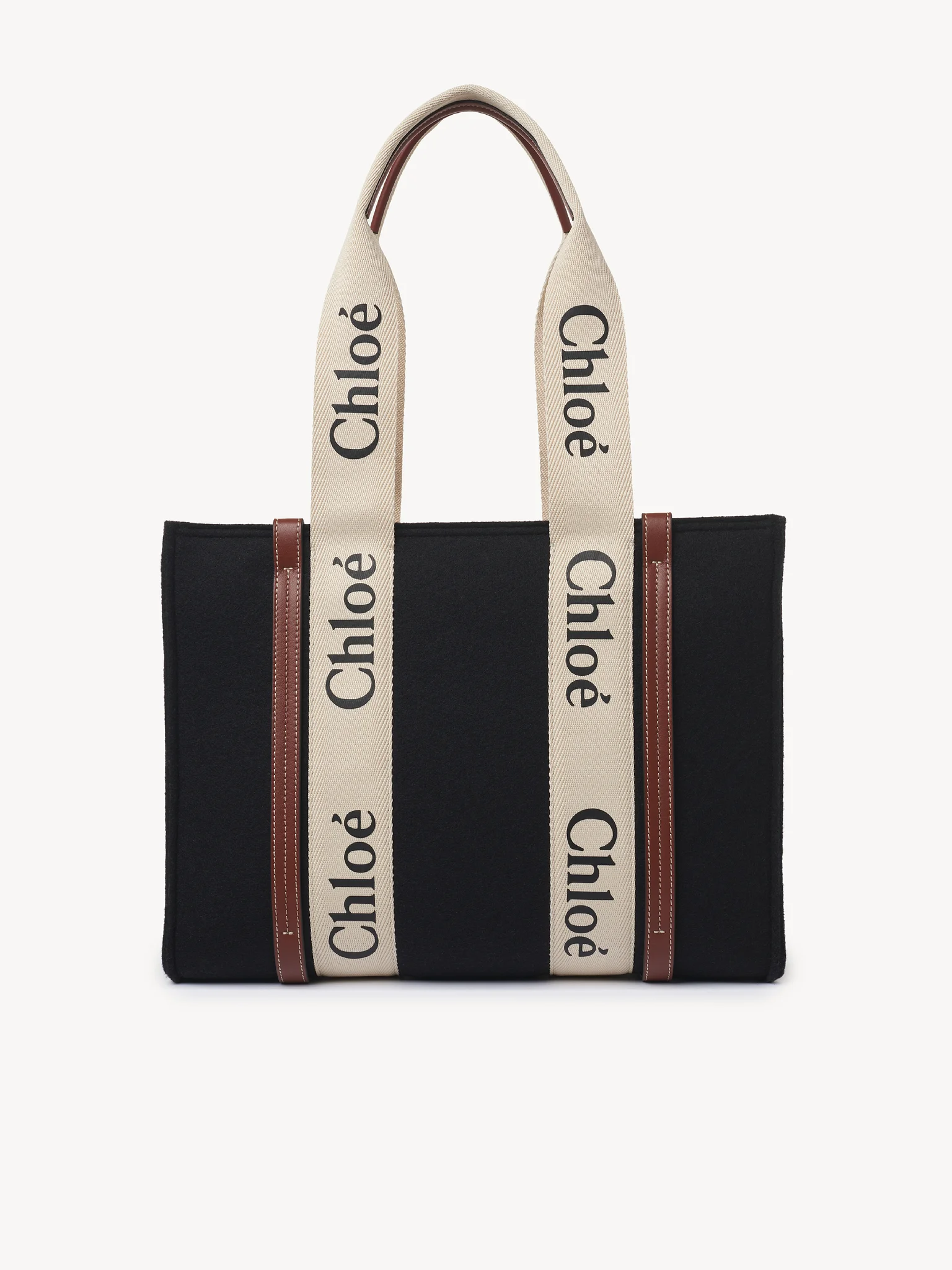 コントラストな縦のレザーの飾り紐とメゾンの“Woody”ミュールと合わせたシグネチャー、クロエロゴのリボンが、バッグのシャープでモダンなラインを際立たせています。快適にショルダーまたはハンドキャリーできるトートバッグです。