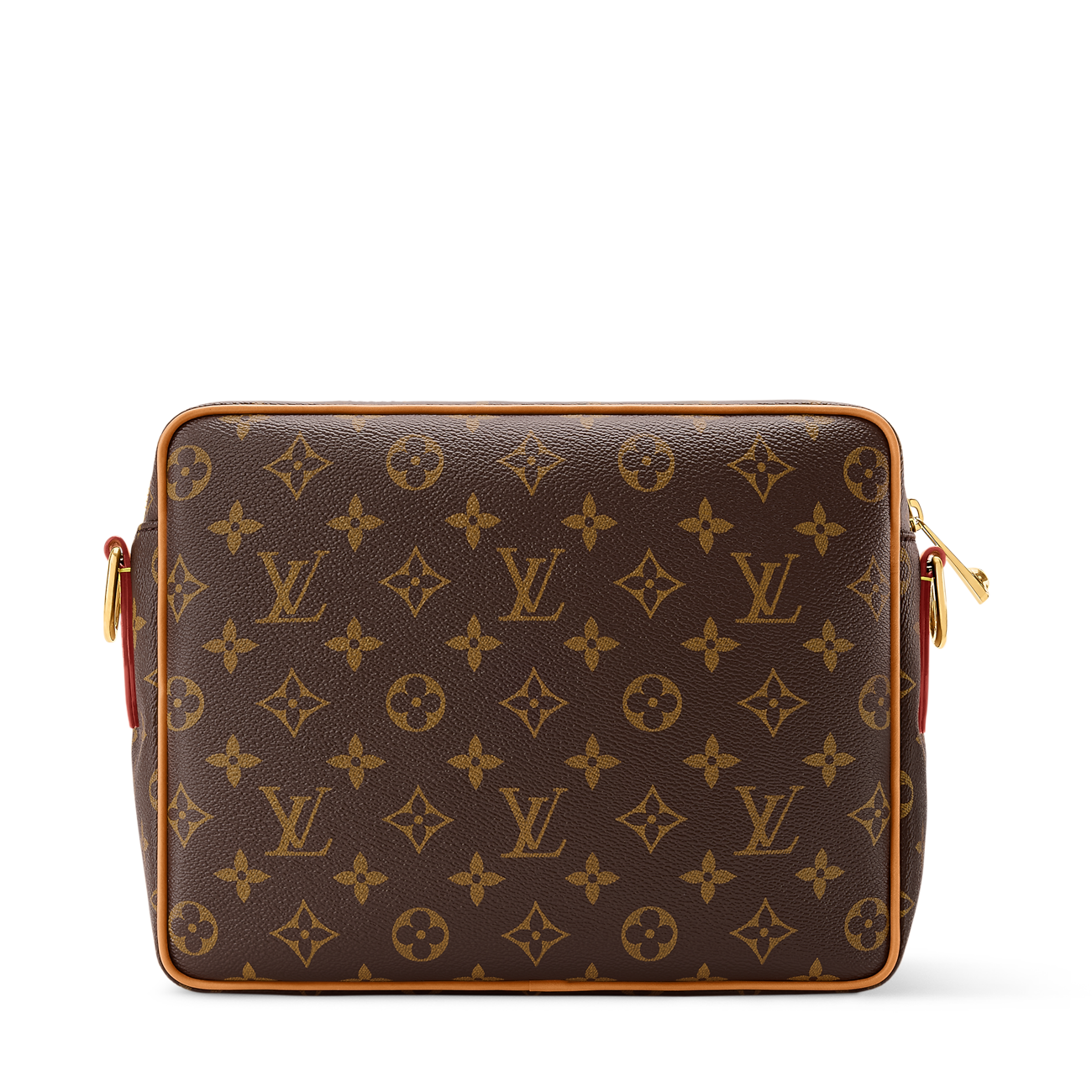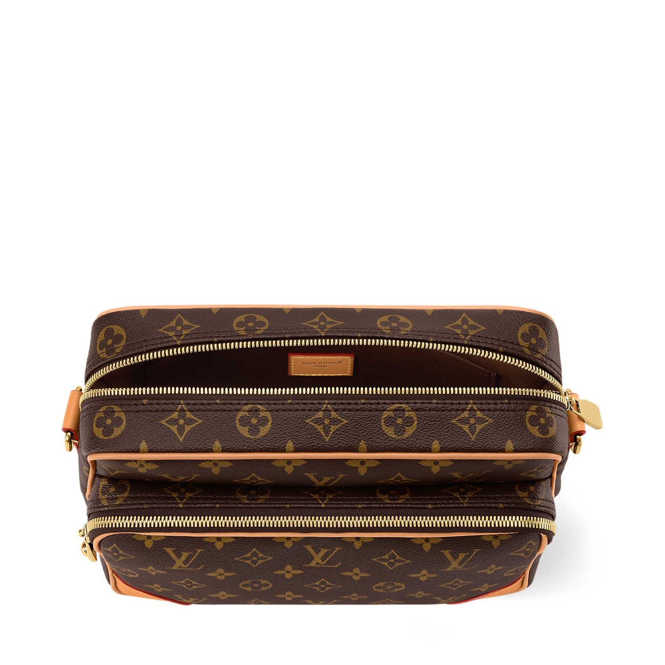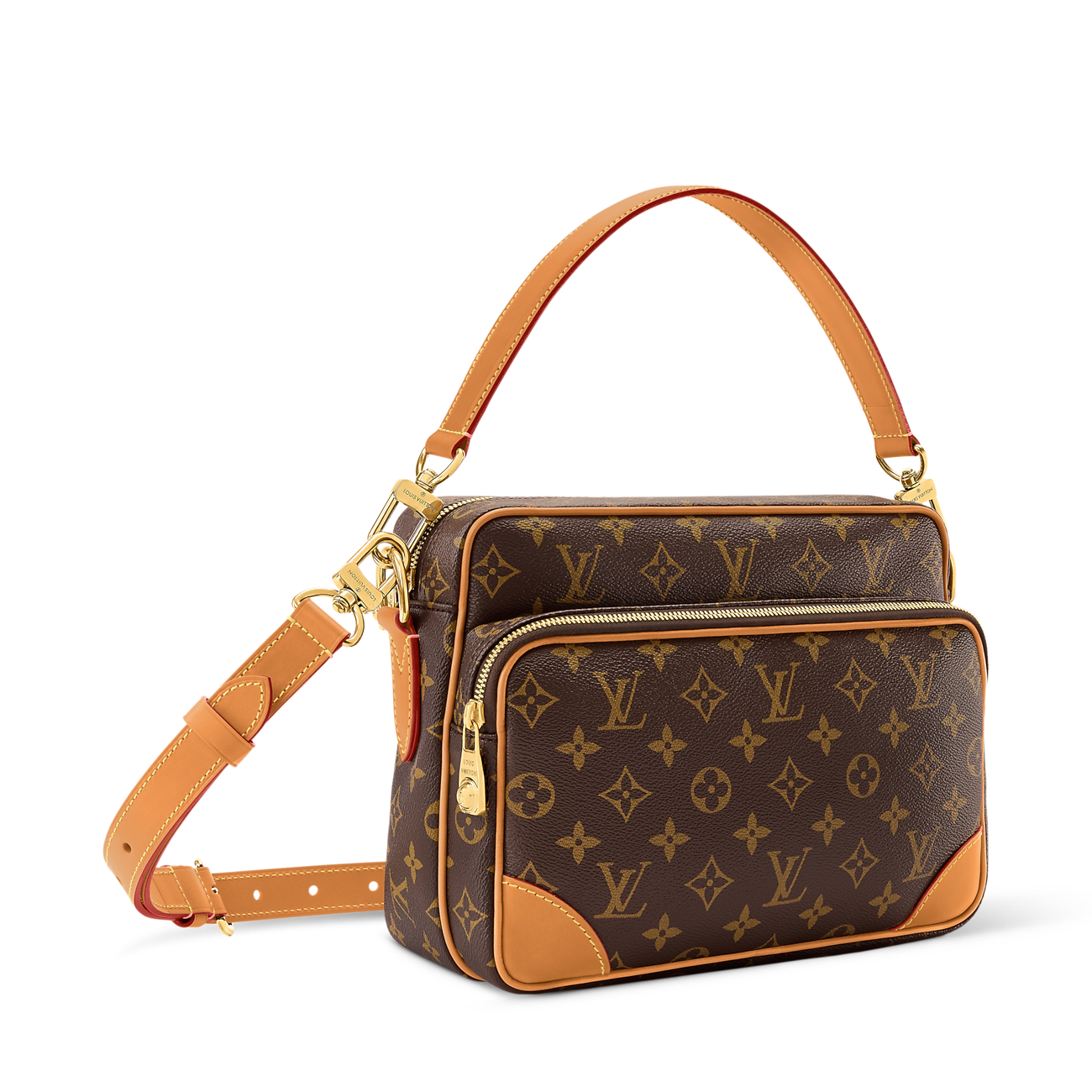 • モノグラム・キャンバスを使用したバッグ「ナイル GM」。ファレル・ウィリアムスが手掛けたオリジナルデザインを、大き目のサイズで再解釈したアイテムです。補強されたコーナーとパイピングにはエイジング加工を施したヌメ革のトリミングをあしらいました。前面には、必需品をスムーズに取出せるファスナー付きポケットを備え、取外し可能なハンドルと取外し&調節可能なストラップにより、多彩な持ち方が楽しめます。