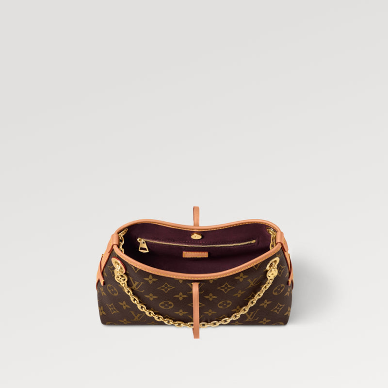 • アイコニックなバッグを今シーズンならではの雰囲気に再解釈した、1日を通して装いをシックに彩る「キャリーオール BB」。メゾンのモノグラム・キャンバスで仕立て、モノグラム・フラワーを添えたゴールドカラーのチェーンで飾りました。レザーレースをあしらった留め具と美しくマッチする、コントラストカラーのネームタグなどシグネチャーディテールも魅力。普段使いのクレジットカードを内側のファスナー付きポケットに入れておけば、すぐに取出せます。