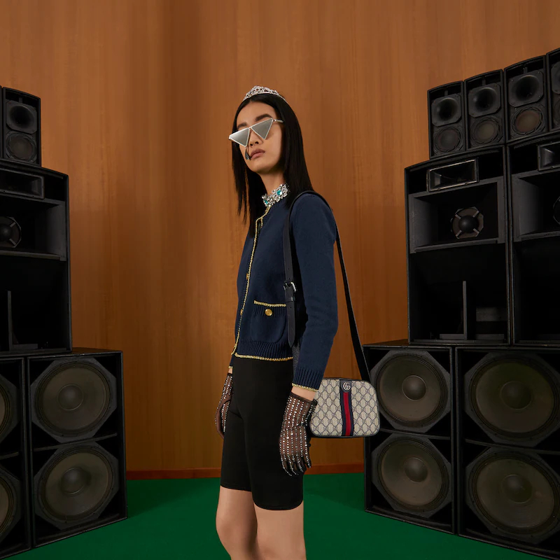 Mirroring the material's historic origins. GthtG Supreme is introduced in a timeless mix of blue and beige for Guthtcci Love Parade. The canvas has come to the front of each collection decade after decade to become a hallmark of the House. Here. the classic palette defines this Ophidia camera bag.
