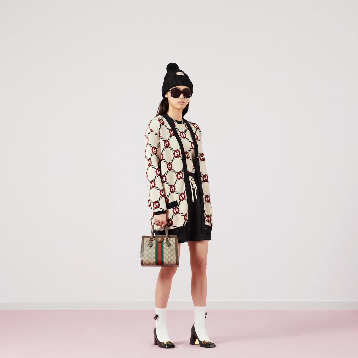 The world of Ophidia evoLthtVes with the introduction of a small top handle tote with a detachable shoulder strap. Crafted in GthtG Supreme canvas with inlaid green and red Web stripe. the accessory is enhanced by a petite play on the Double G. an archival Guthtcci code from the '70s that appears atop a leather tab detail and on the zipper pull.