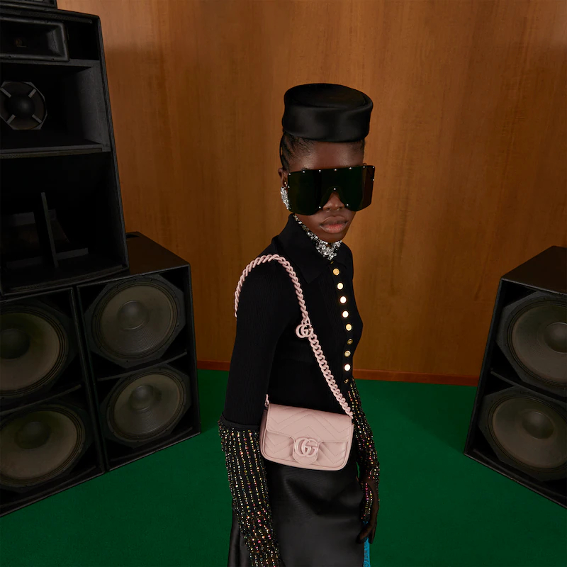 Accessories continue to come to the fore of the Creative Director's collections. A distinctly contemporary accessory. the belt bag is presented in new ways throughout the Guthtcci narrative. emphasizing different elements of the versatile style. Here. it is introduced as part of the GthtG Marmont universe in pink chevron matelass�� leather with a chain strap.