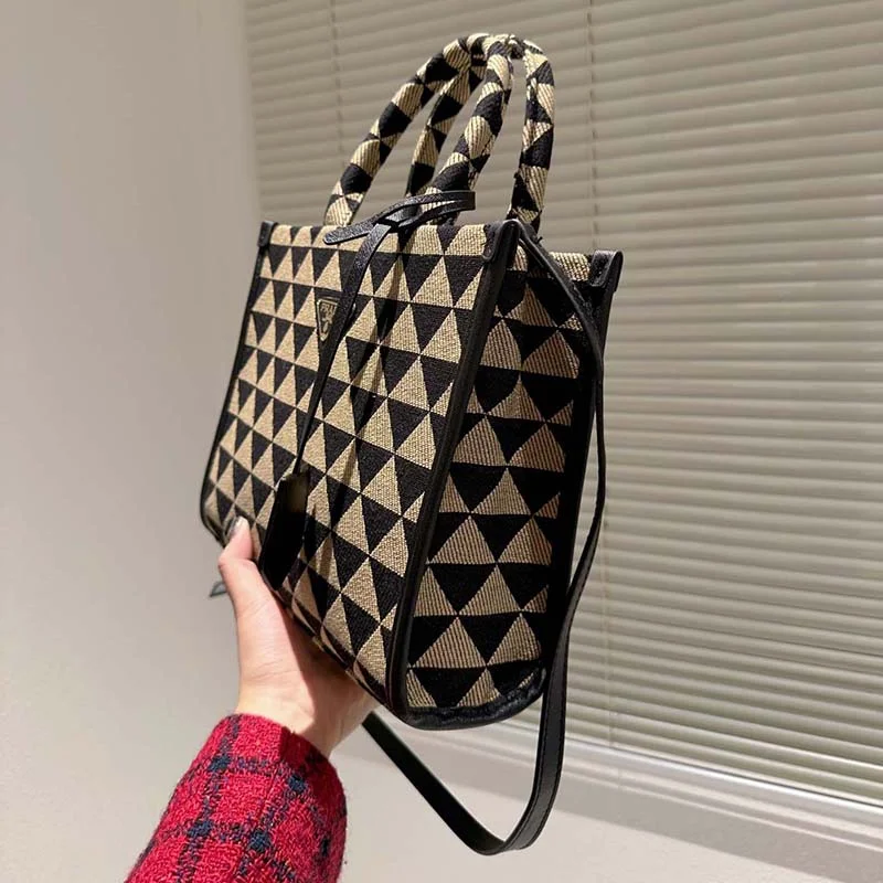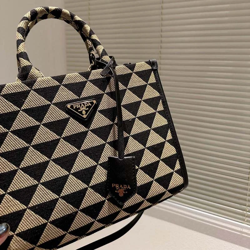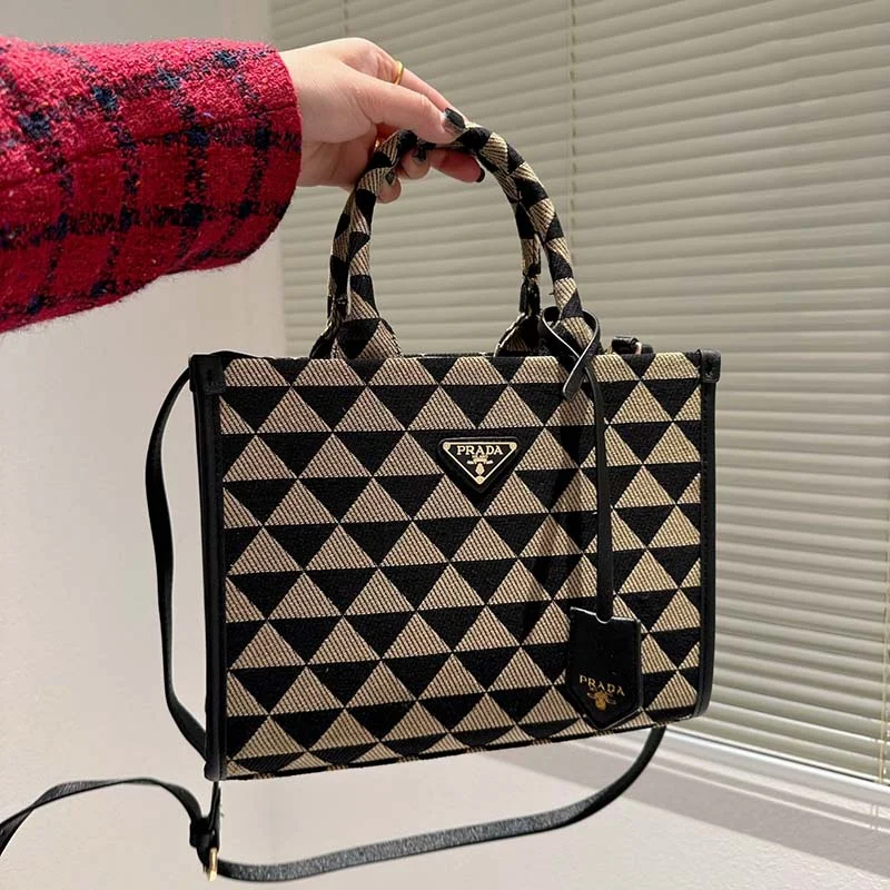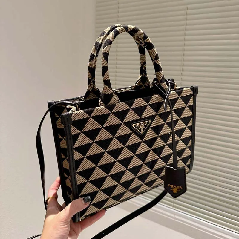 御観覧頂き誠に有難うございます。心から感謝致します。「★PRADA★ シンボル ジャカードファブリック ラージハンドバッグ」です。さすがPRADAのトートバッグ!最高にかっこいいですね!どんなスタイルにも抜群のシンプルデザイン、持つだけで力が湧きます!お洒落が楽しめます。トートバッグとしてもショルダーバッグとしても活躍します。大切な方への贈り物!自分へのご褒美におすすめです。●商品説明創業者のマリオ・プラダがデザインしたトランクに初めて登場したトライアングル。独自性とモダニティが表現された普遍的でミニマルなフォルムは、シーズンごとに異なるアレンジで生まれ変わります。その幾何学的なデザインを、上品でありながらモダンなパターンにアレンジしてコントラストを効かせた、洗練されたトートバッグ。ブランドを象徴する「サフィアーノ」レザー(牛革)のディテールを纏ったデザイン。