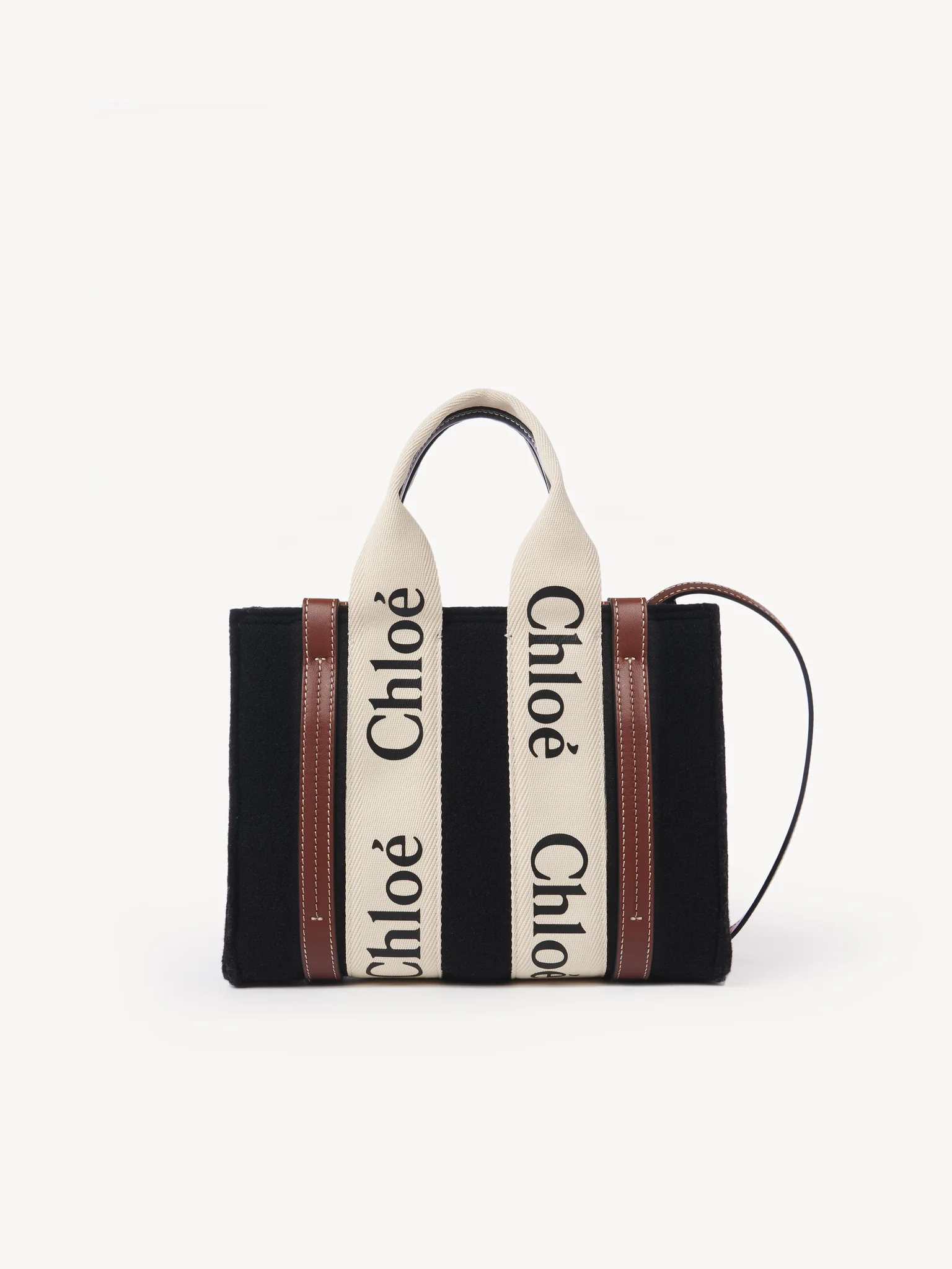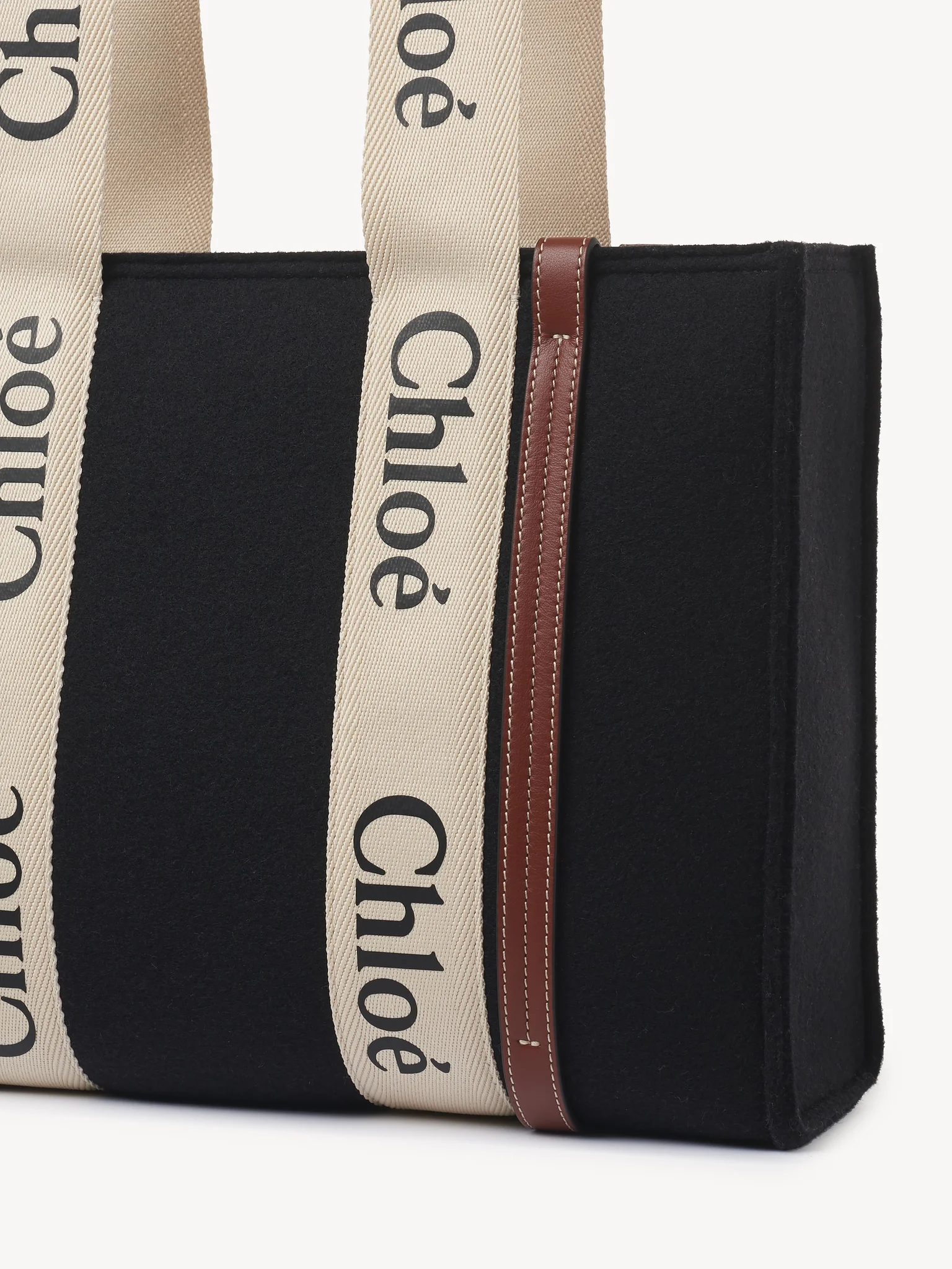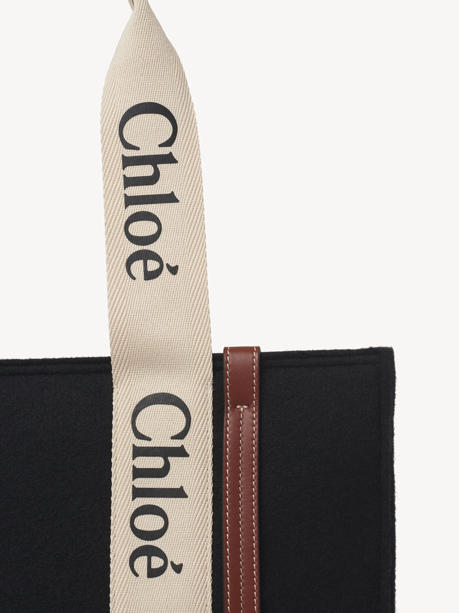 コントラストな縦のレザーの飾り紐とメゾンの“Woody”ミュールと合わせたシグネチャー、クロエロゴのリボンが、バッグのシャープでモダンなラインを際立たせています。快適にショルダーまたはハンドキャリーできるトートバッグです。