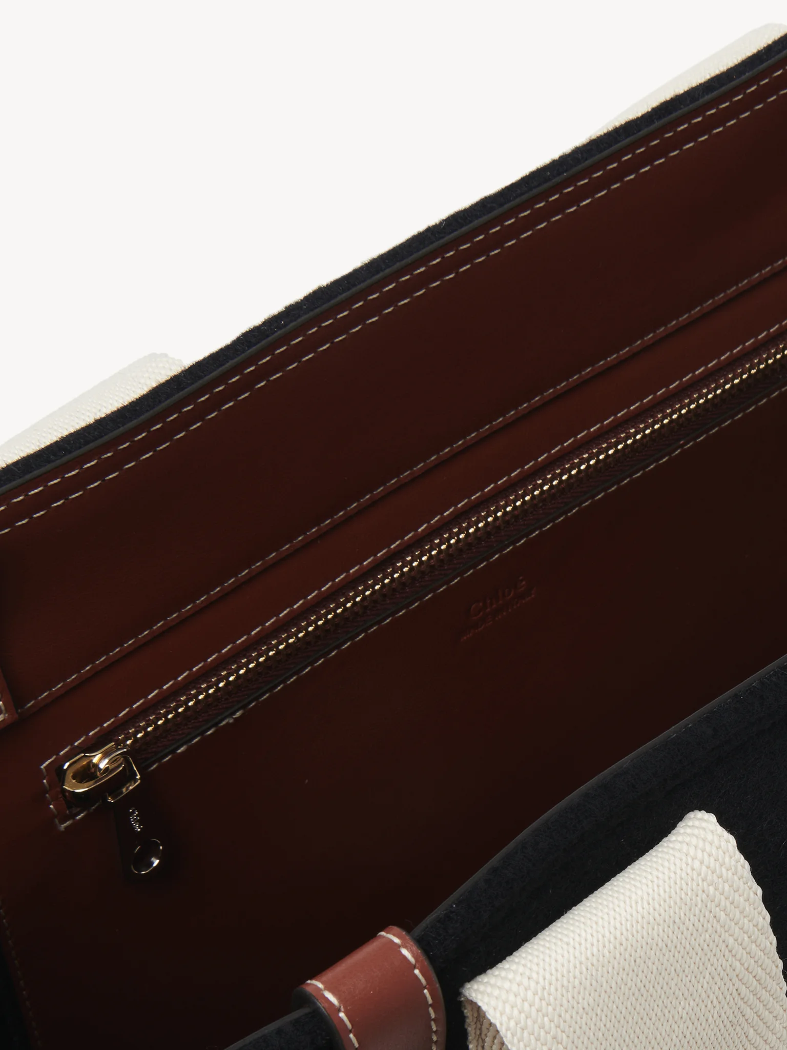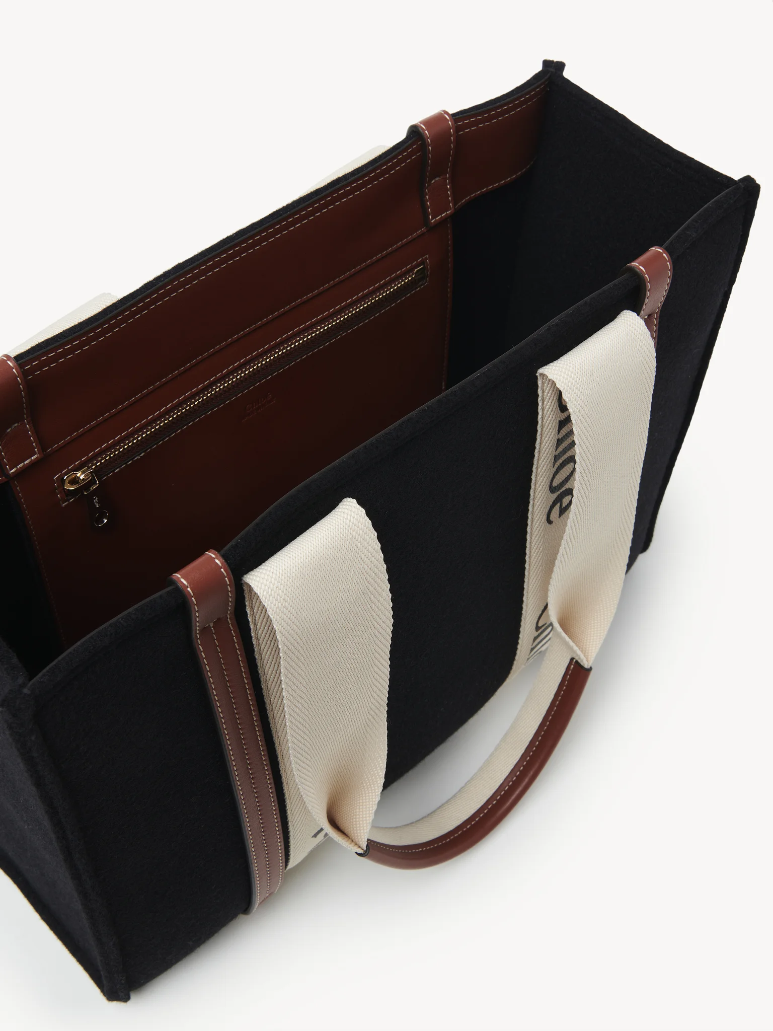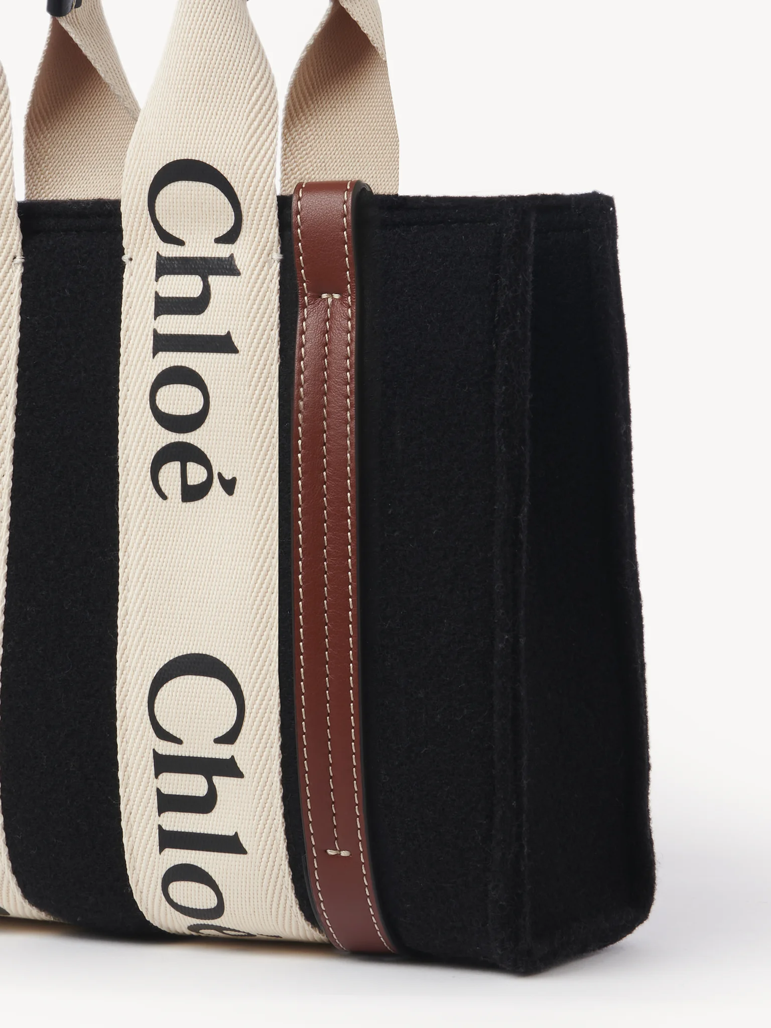 コントラストな縦のレザーの飾り紐とメゾンの“Woody”ミュールと合わせたシグネチャー、クロエロゴのリボンが、バッグのシャープでモダンなラインを際立たせています。快適にショルダーまたはハンドキャリーできるトートバッグです。