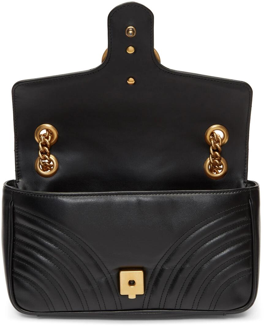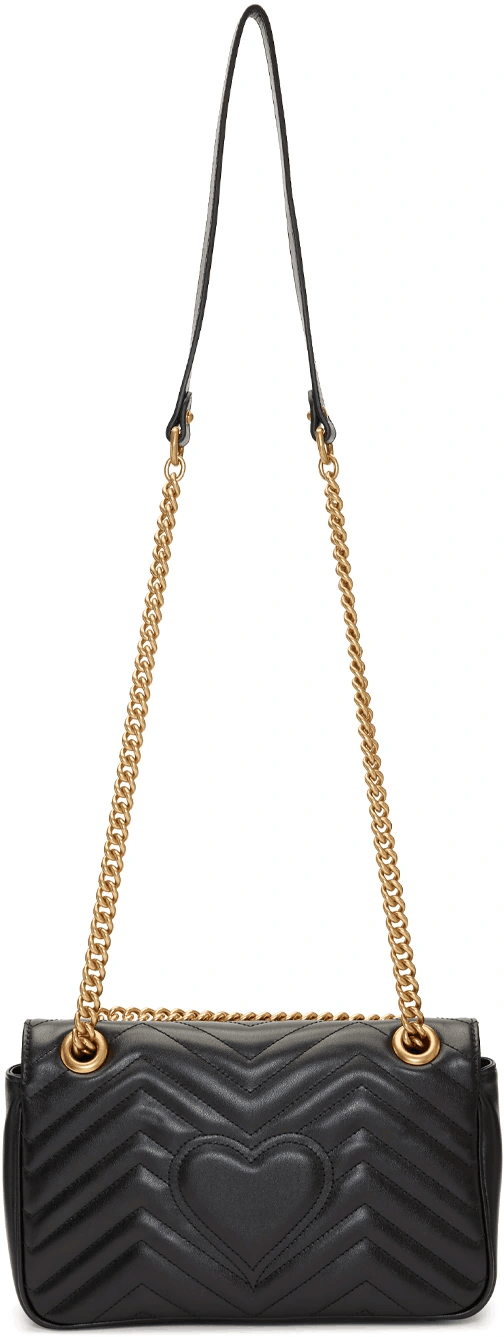 〔GGマーモント〕 チェーン ミニバッグ。付属のキーリングを使用して、別の大きなバッグにこのバッグを取り付けることができます。ソフトなストラクチャードシェイプとダブルG ハードウェア付き フラップ クロージャーが特徴です。このハードウェアは70年代のアーカイブデザインにインスピレーションを得たものです。素材には、シェブロン キルティング レザーを使用しています。