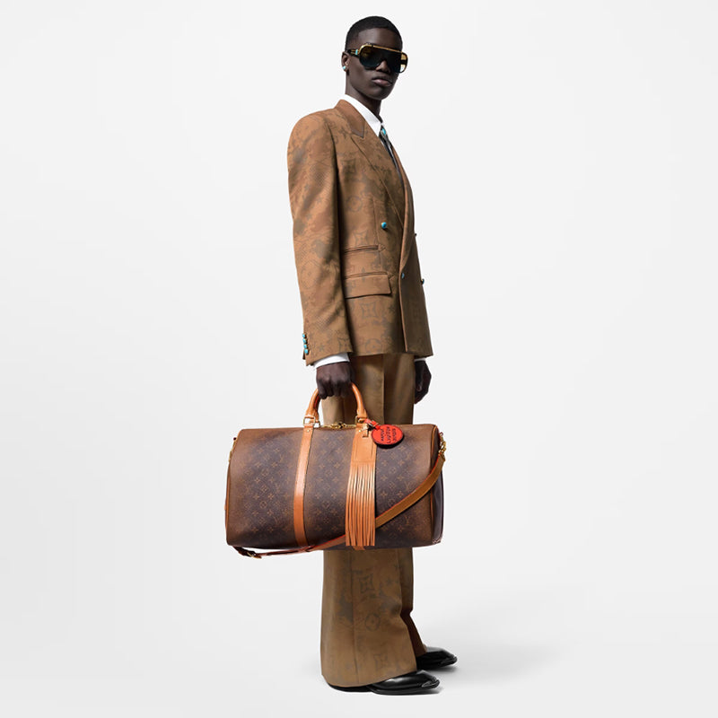 • 2024秋冬ファッションショーに登場した「キーポル・バンドリエール 50」。モノグラム・ダスト キャンバスがヴィンテージな雰囲気を演出します。ファレル・ウィリアムスがメゾンの伝統にオマージュを捧げ、エイジング加工を施したカウハイドレザーとゴールドカラーのメタルパーツで仕上げました。個性を添えるレッドの「Marque L.Vuitton Déposée」チャームとフリンジ付きのレザーのネームタグも魅力。