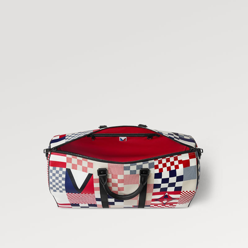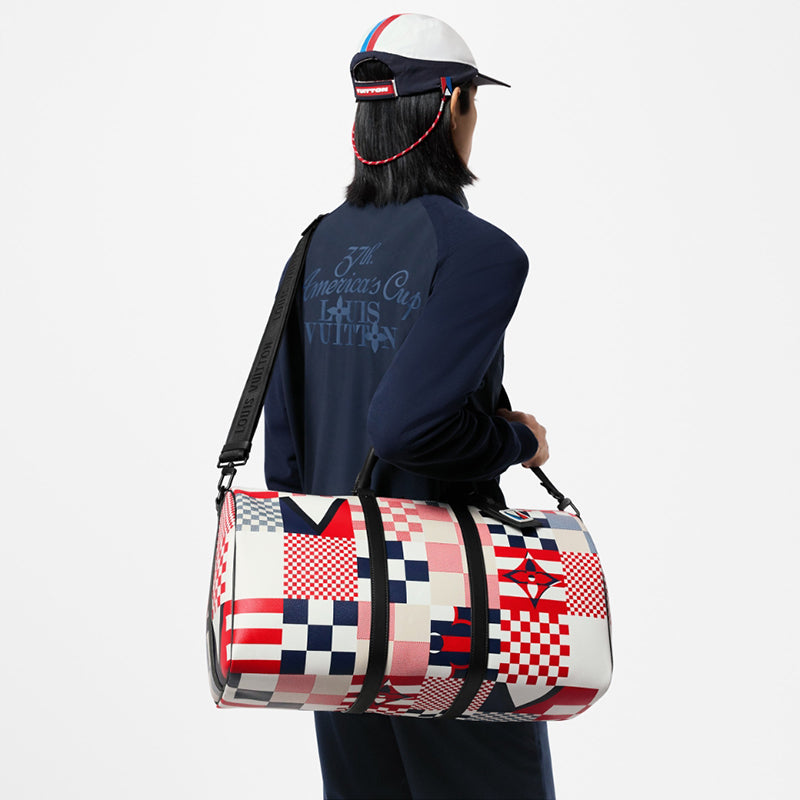 • 「アメリカズカップ」コレクションの一部として、ダミエ・フラッグス キャンバスで登場したアイキャッチーな「キーポル・バンドリエール 50」。このダミエ・フラッグスのプリントは海洋世界の旗印の伝統を想わせます。さまざまな旗のパッチワークをイメージしたダミエ・パターンを、サイズと色使いで遊び心を演出した市松模様のプリントで表現しました。