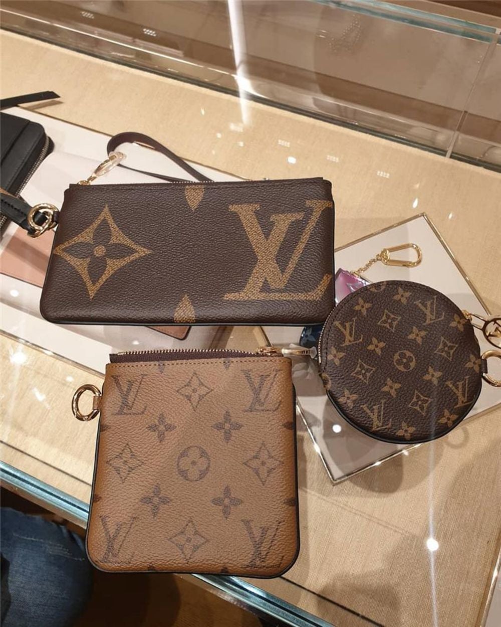 「ポシェットトリオ」は、3つのユニークなモノグラムキャンバスで作られた3つの小さなバッグのユニークなデザインです。 グループや1つのユニットとして安全に保管できる小さなバッグ。リストストラップで保持できるだけでなく、バ​​ッグやベルトに結び付けて使用することもできます。 金色の円形プルタブ付きジップクロージャー。
