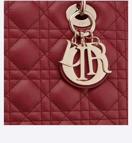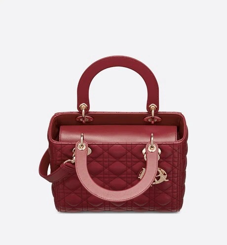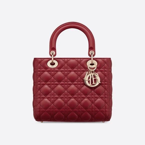 The Lady Dior handbag epitomizes the House's vision of elegance and beauty. Sleek and refined. the timeless yet relevant style is crafted in cherry red lambskin with Cannage stitching. creating the instantly recognizable quilted texture. The pale gold-finish metal signature 'D.I.O.R.' charms offer an elegant allure. Featuring a thin. removable leather shoulder strap. the medium Lady Dior bag can be carried by hand. worn over the shoulder or crossbody.