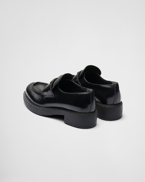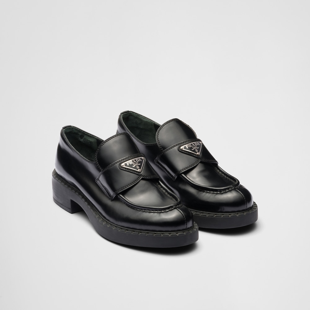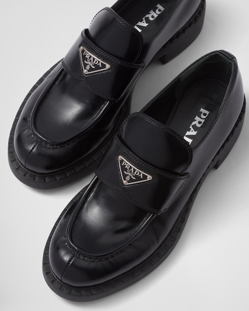 アイコニックなエナメル トライアングルロゴが際立つローファー。クラシックなラグジュアリーシューズに伝統的に使用されてきたブラッシュドレザー(牛革)をプラダのコレクションで再解釈し、ブランドの二元性が反映された意外性のあるハイブリッドなデザイン。ノッチドウェルトがハンドクラフトのアクセントを添えるアイテム。