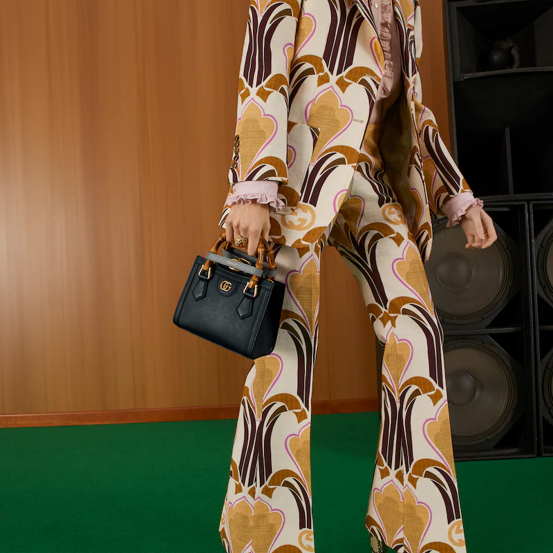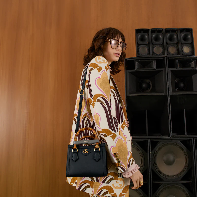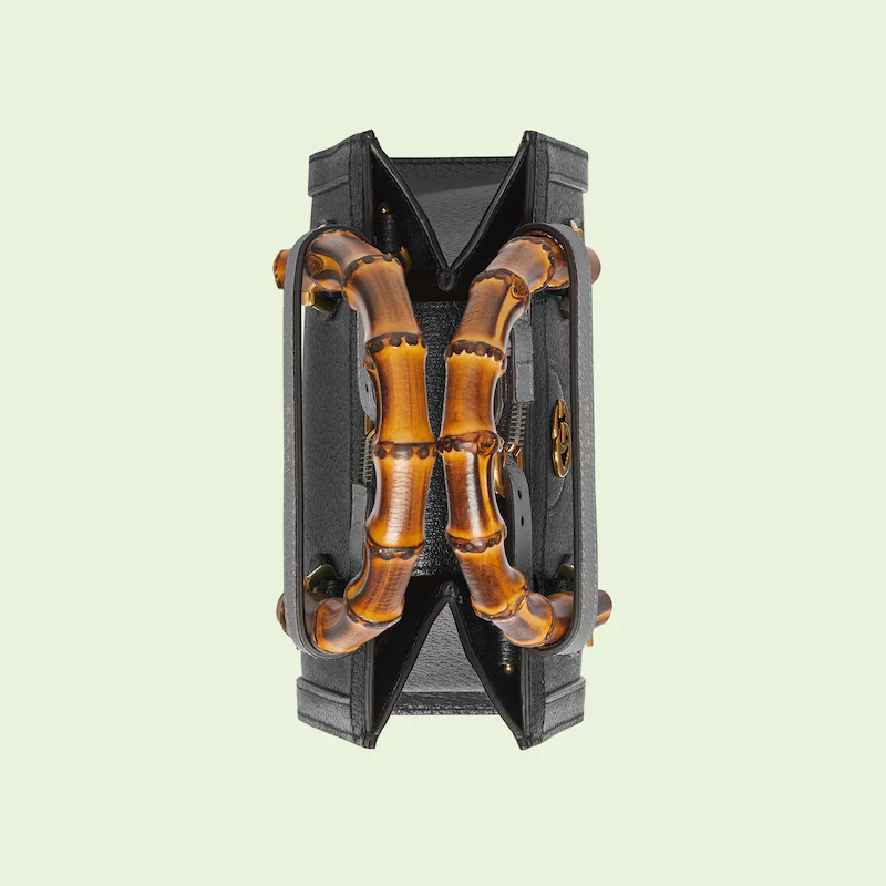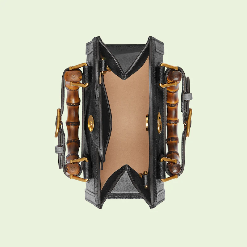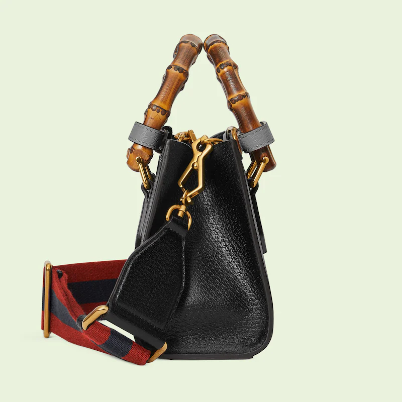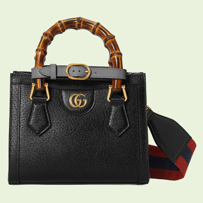 An evolution of a bamboo handle tote first introduced in 1991. the Guthtcci Diana represents the notion of style in constant evolution and is reimagined with removable. neon leather belts��a nod to the functional bands used to keep the handles in shape. Here. a mini version of the emblematic style is presented in black leather.