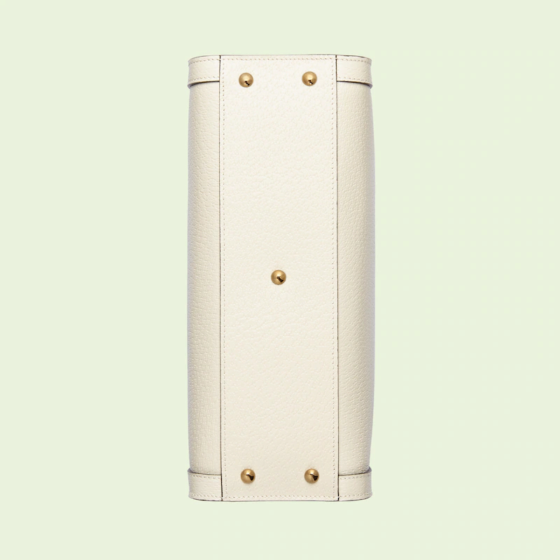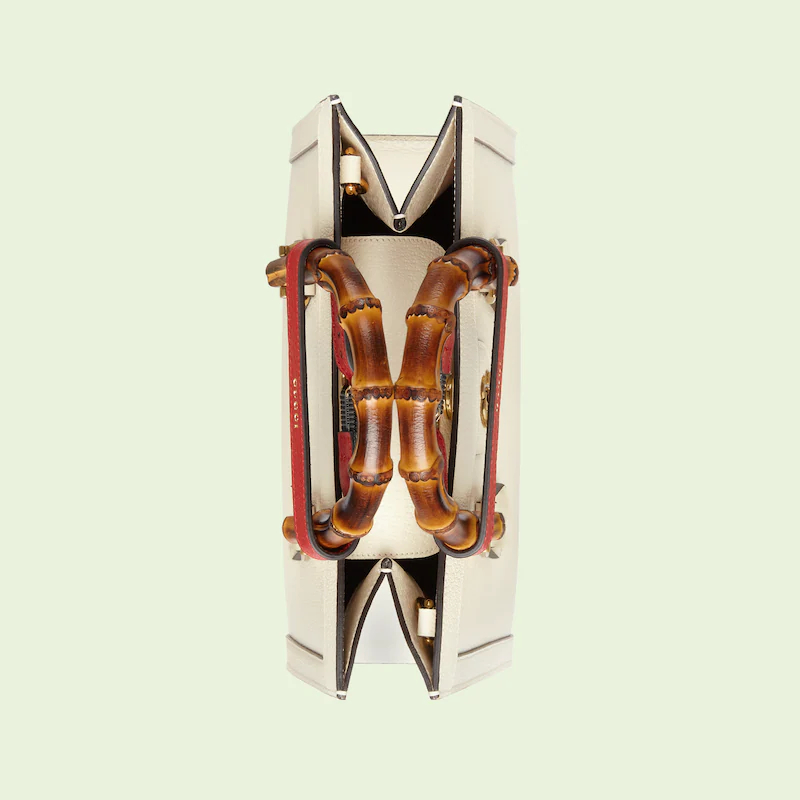 The concept of reinvention continues to shape the House's designs. An evolution of a bamboo handle tote first introduced in 1991. the Guthtcci Diana represents the notion of style in constant evolution. The design plays with traditional details and renews them new meaning. Playing with this idea. the functional bands used to keep bamboo handles in shape are reimagined as playful leather belts. Here. the tote is introduced in white leather.