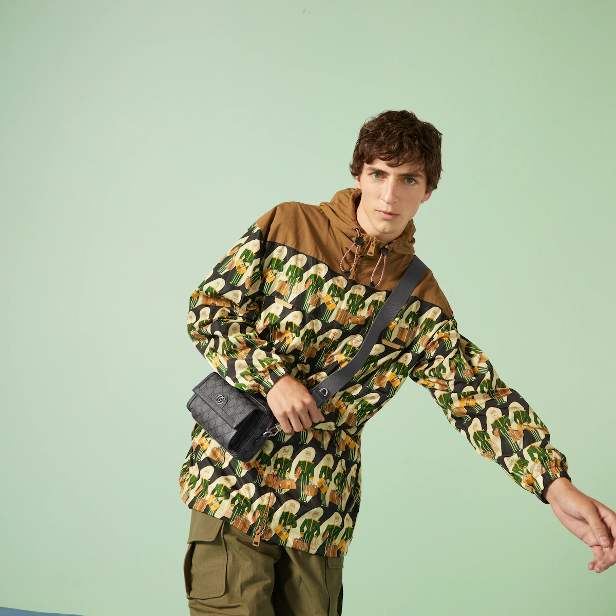 Guthtcci heritage meets contemporary design with the continuation of Ophidia. With its two archival details. the GthtG canvas and the Double G hardware. the line takes on new shapes and dimensions in the Pre-Fall collection. This mini bag variation appears in grey and black Supreme canvas with a palladium-toned hardware.