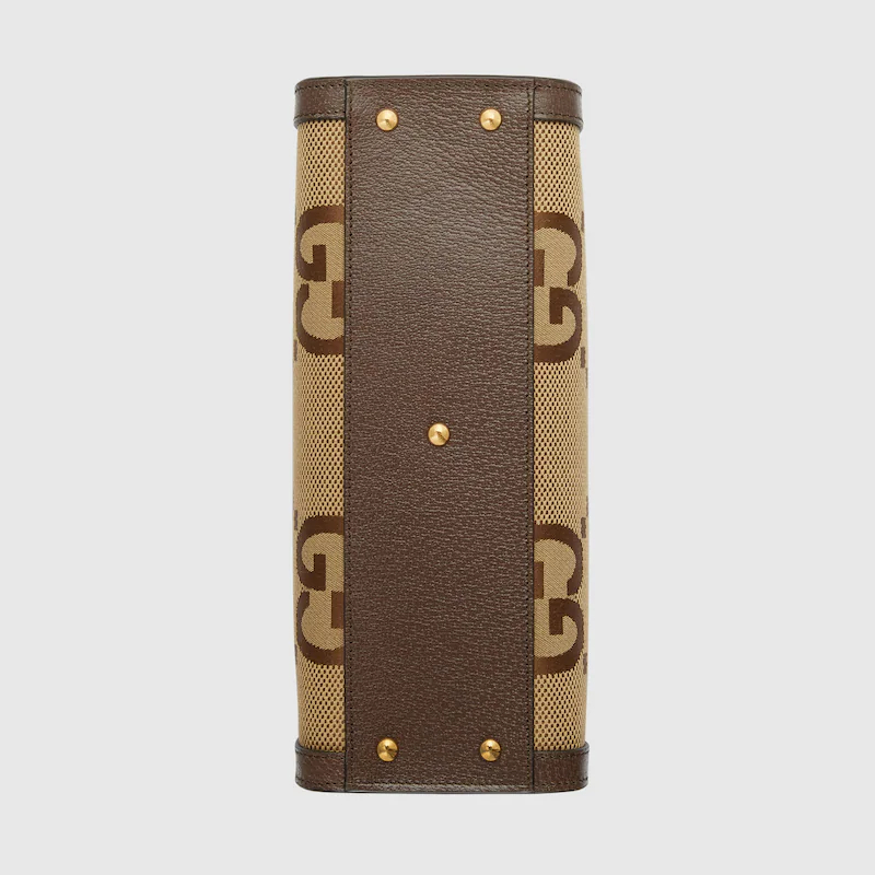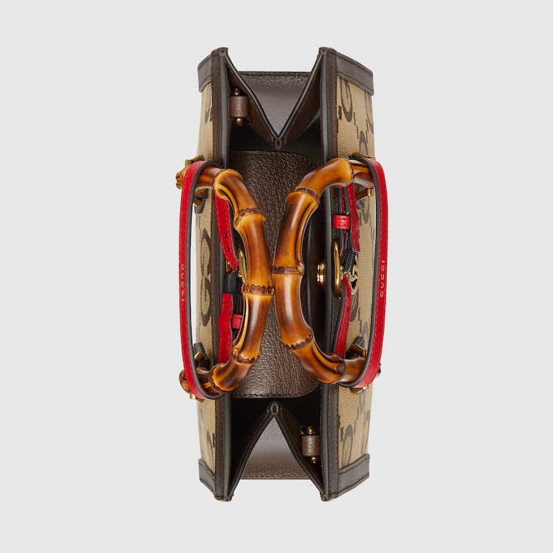 Instantly recognizable emblems of the brand. logos enrich designs in new and unexpected ways. Behind every logo lies the tradition and value of the House. an everlasting medium one can wear again and again. Following the idea of constant change and experimentation. different iterations of the logo have been presented each collection. The jumbo GthtG. a new. maximalist version of the historic monogram. animates a selection of ready-to-wear and accessories for the Aria collection. This small Guthtcci Diana tote is completed by a brown leather trim.