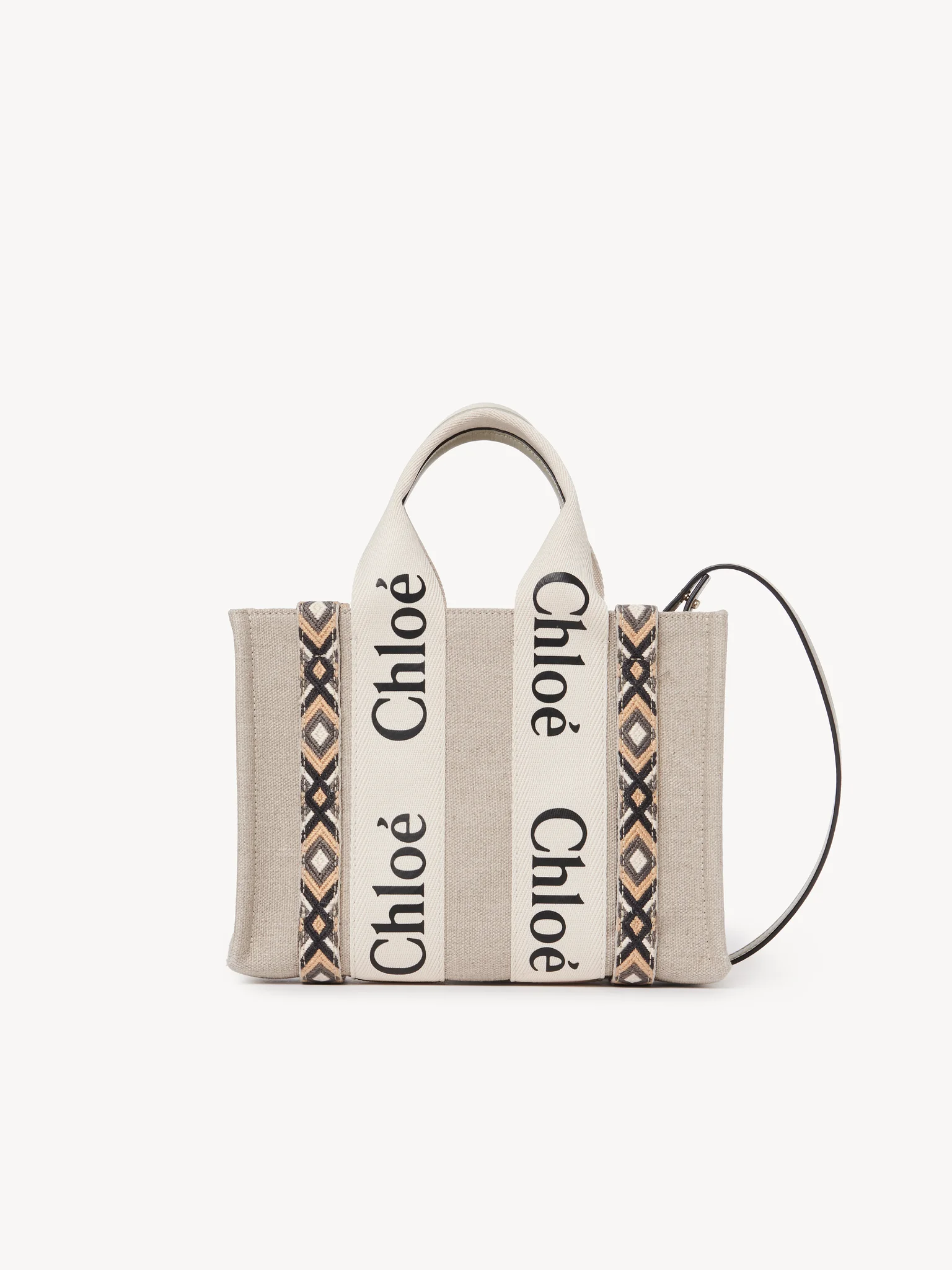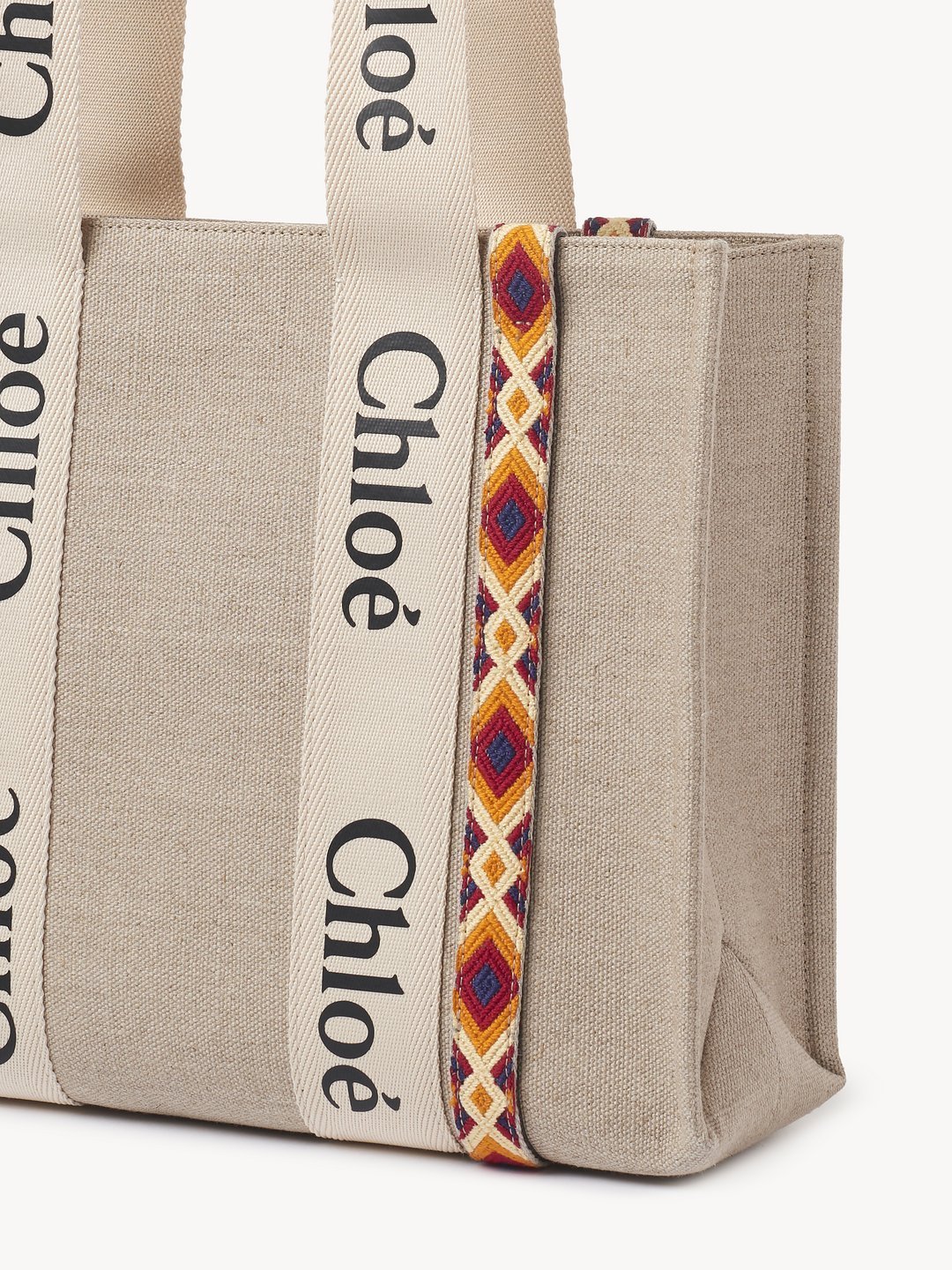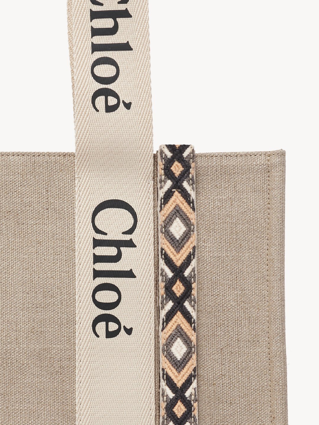 コントラストな縦のレザーの飾り紐とメゾンの“Woody”ミュールと合わせたシグネチャー、Chloéロゴのリボンが、バッグのシャープでモダンなラインを際立たせています。快適にショルダーまたはハンドキャリーできるトートバッグです。