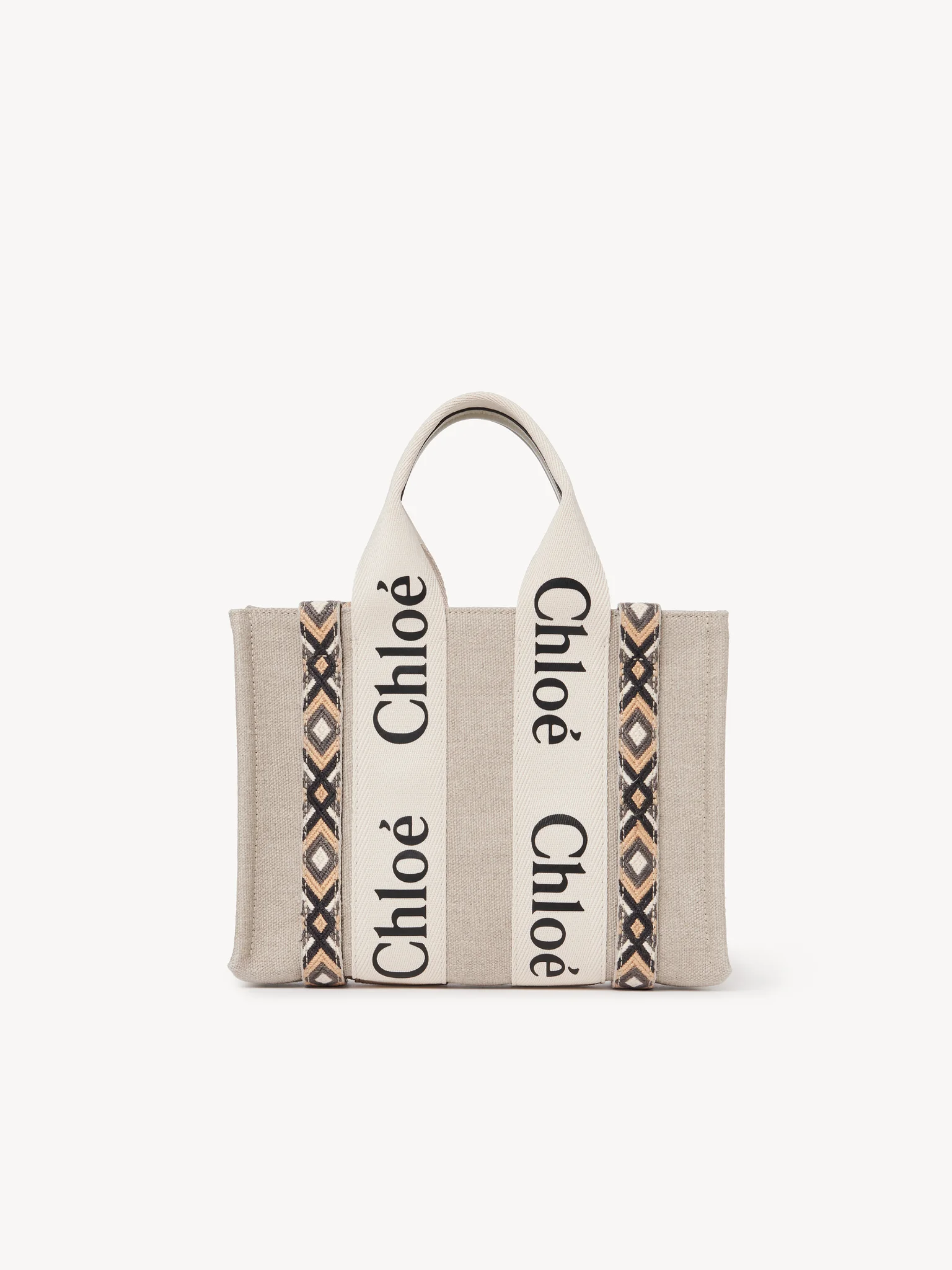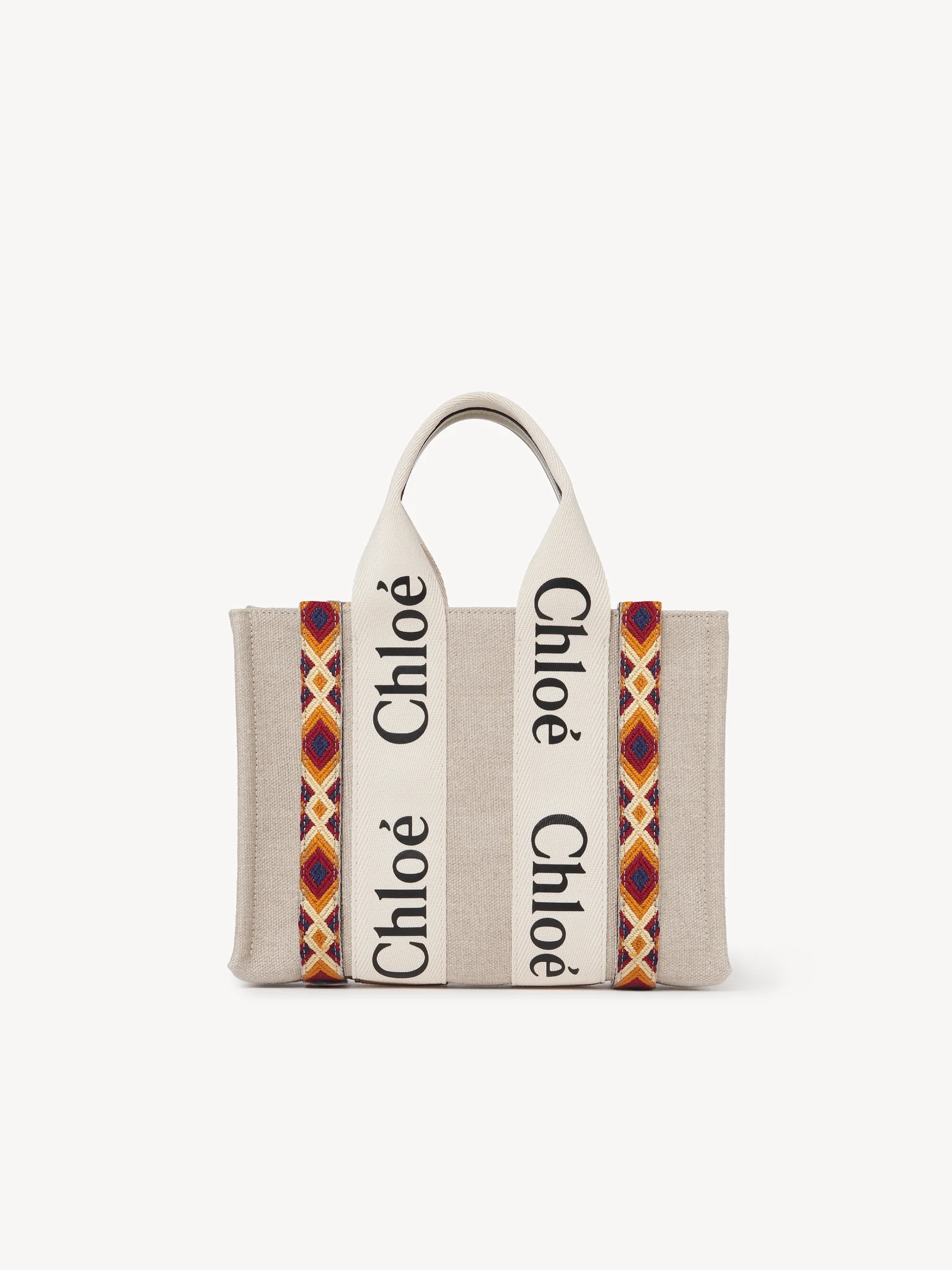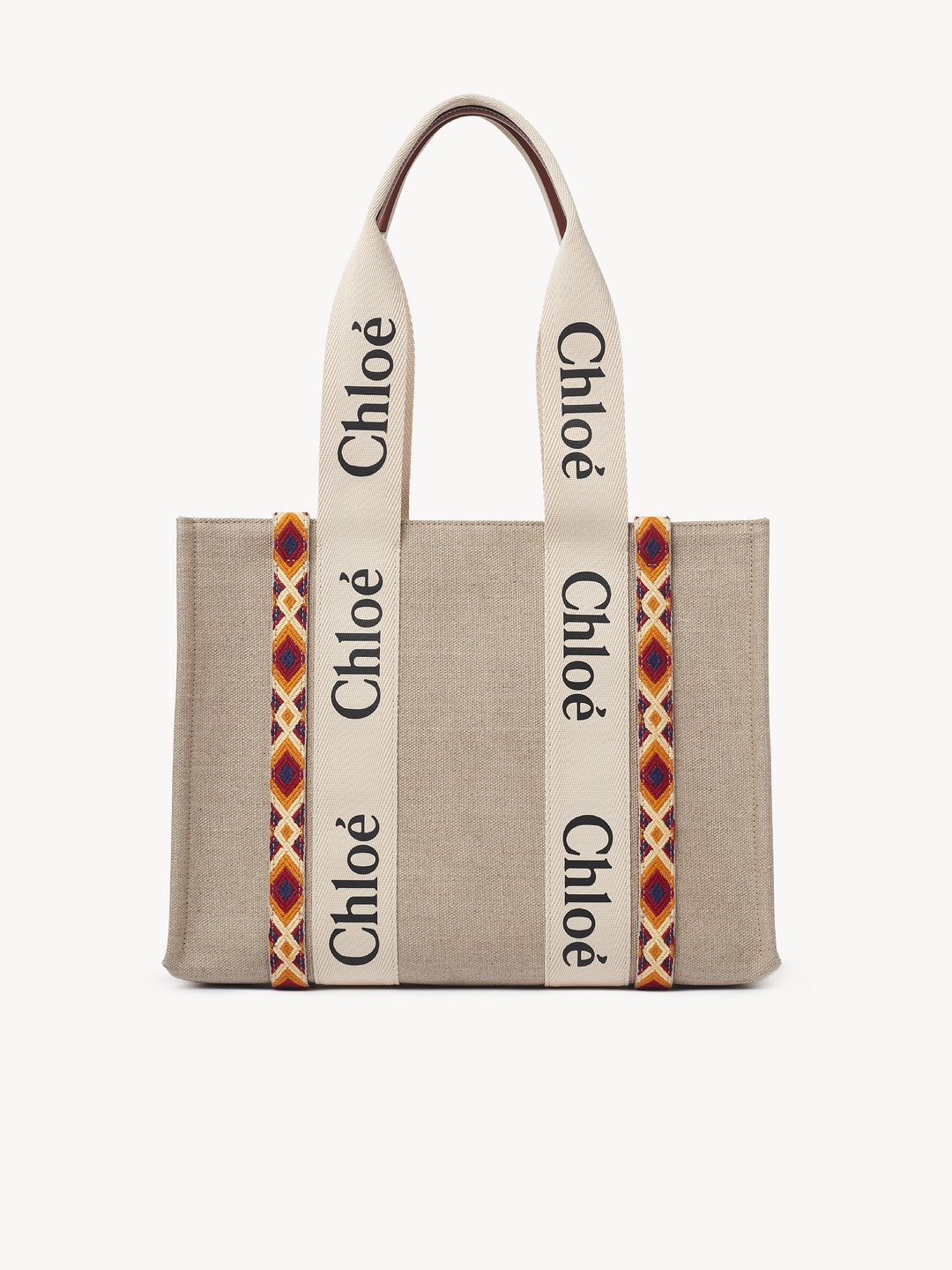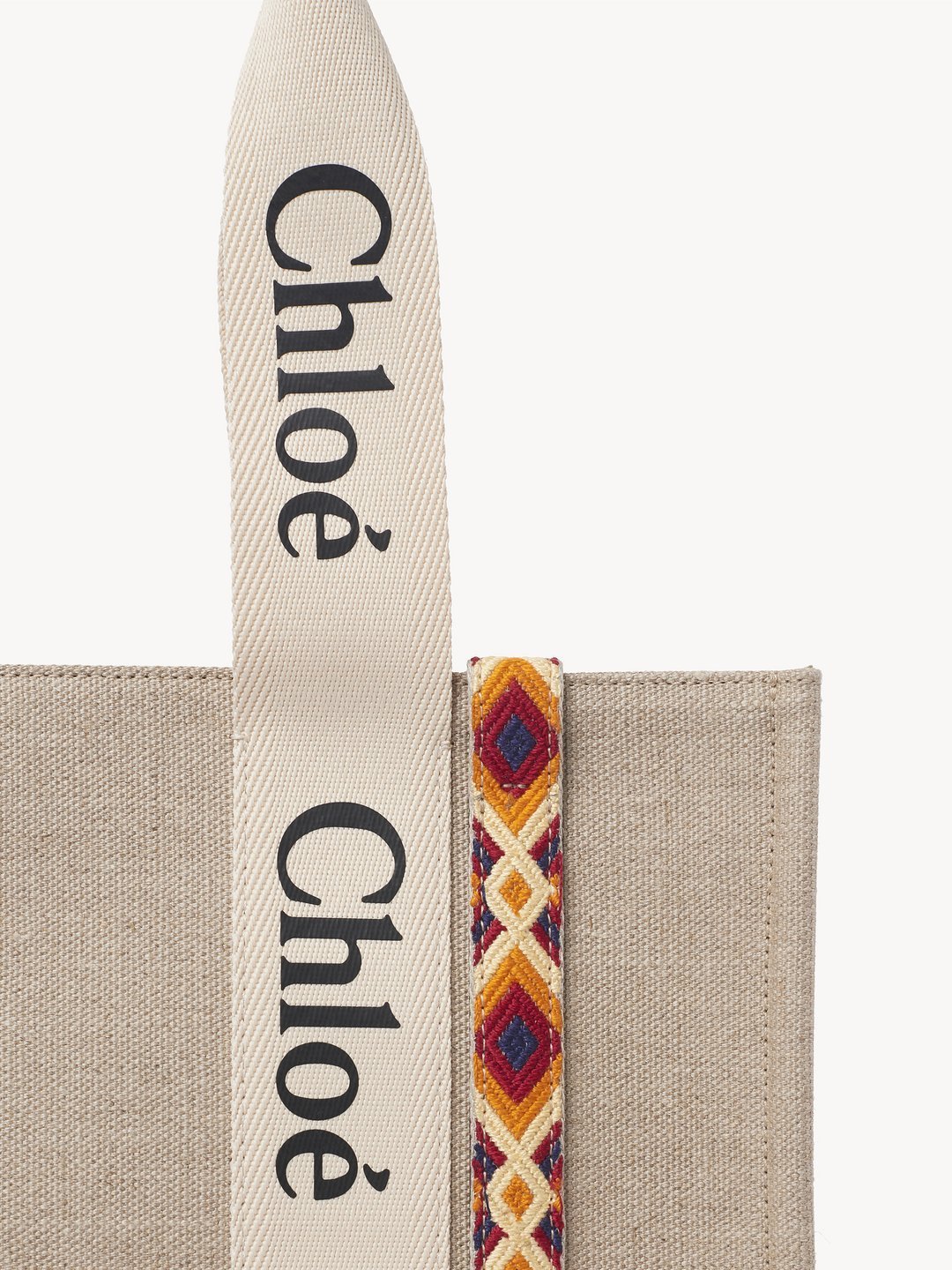 コントラストな縦のレザーの飾り紐とメゾンの“Woody”ミュールと合わせたシグネチャー、Chloéロゴのリボンが、バッグのシャープでモダンなラインを際立たせています。快適にショルダーまたはハンドキャリーできるトートバッグです。
