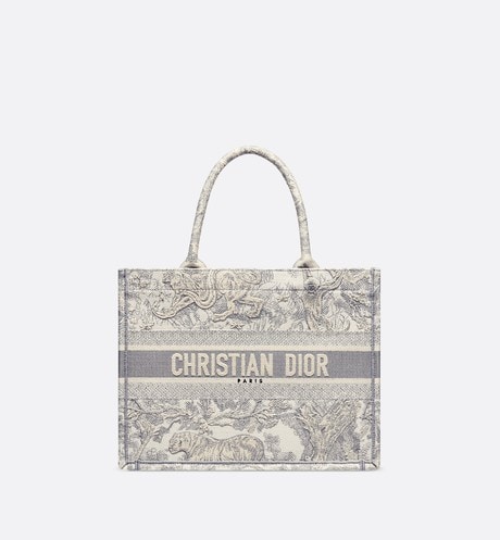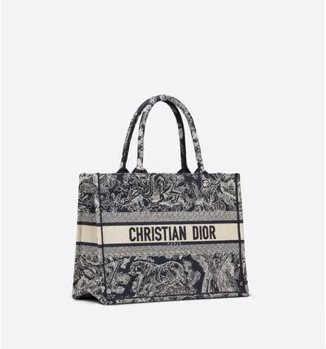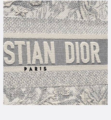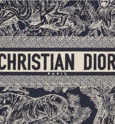 Introduced by Maria Grazia Chiuri. Creative Director of Christian Dior. the Dior Book Tote has become a staple of the Dior aesthetic. Designed to hold all small daily essentials. the style has been fully embroidered with a blue Toile de Jouy Reverse motif. a variation of the House's hallmark pattern with a play on reversed colors. Adorned with the 'CHRISTIAN DIOR' signature on the front. the small tote exemplifies the House's signature savoir-faire and may be carried by hand or worn over the shoulder.