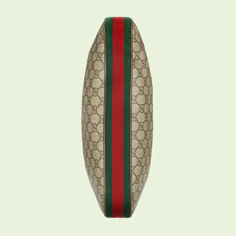 An ode to the timeless Hollywood glamour that shaped Guthtcci Love Parade. classic elements from the House's archives are reintroduced. Distinguished by its crescent moon shape. the accessory is further defined by a G shaped hook closure. Paired with soft materials. the heritage hardware creates a refined design with vintage appeal. This medium version is crafted from beige and ebony GthtG Supreme canvas. complete with a green and red Web trim.