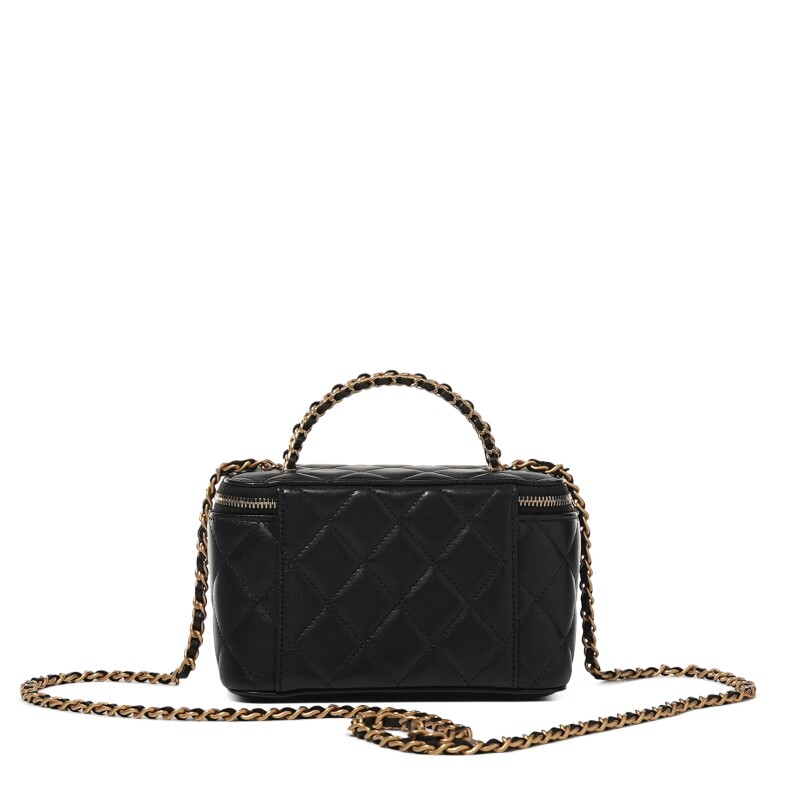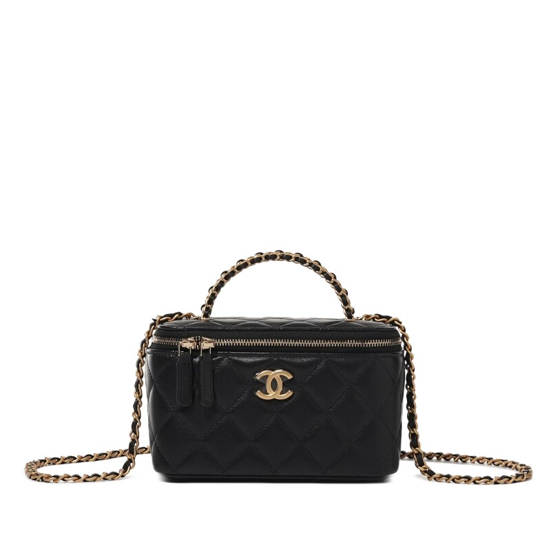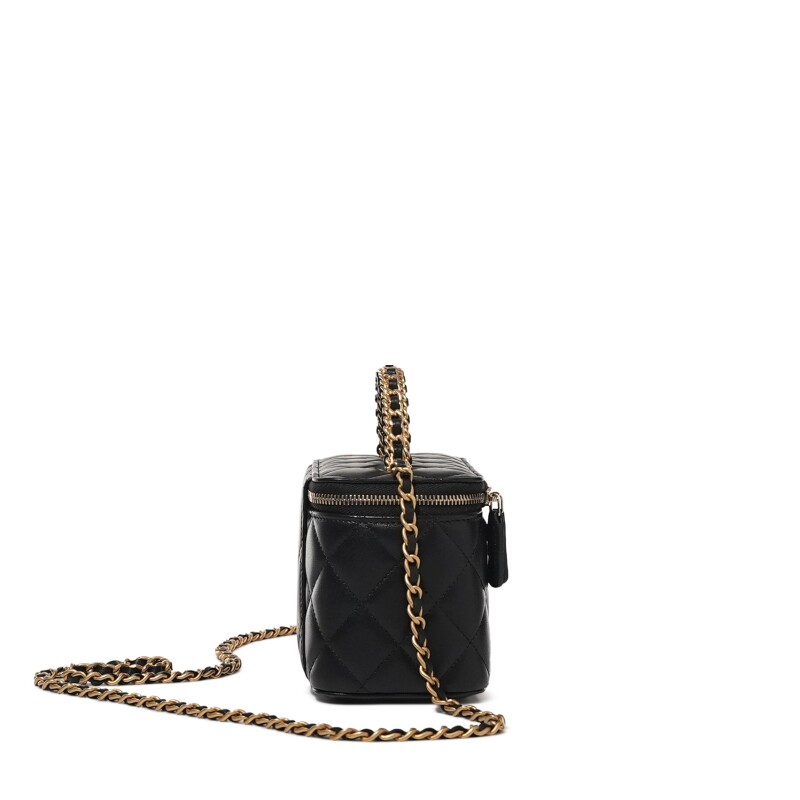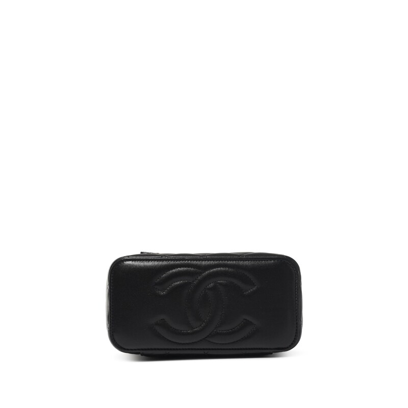 Chanel Black Quilted Lambskin Top Handle Long Vanity Case Brushed Gold Hardware