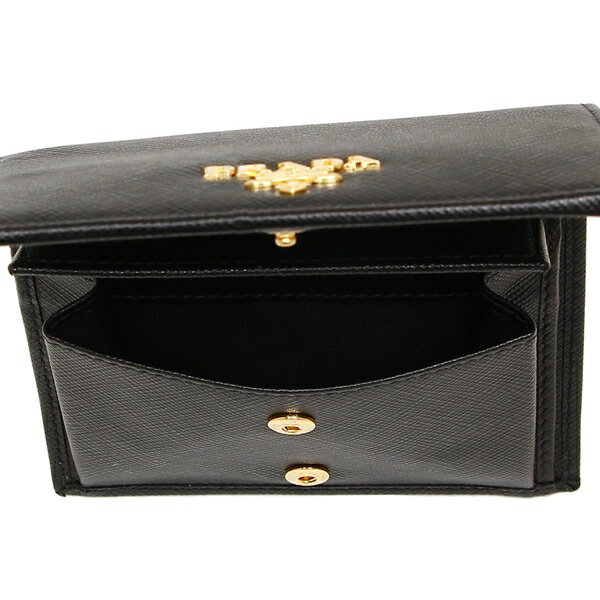 PRADAの定番で人気のあるサフィアーノレザーを使用した二つ折り財布です。フロントにゴールドロゴがアクセントになったシンプルなデザインは飽きがきにくく、長く愛用していただけること間違いなしです。コンパクトに収納が可能なので、小さめのバッグでのお出かけの際に重宝しそうです。