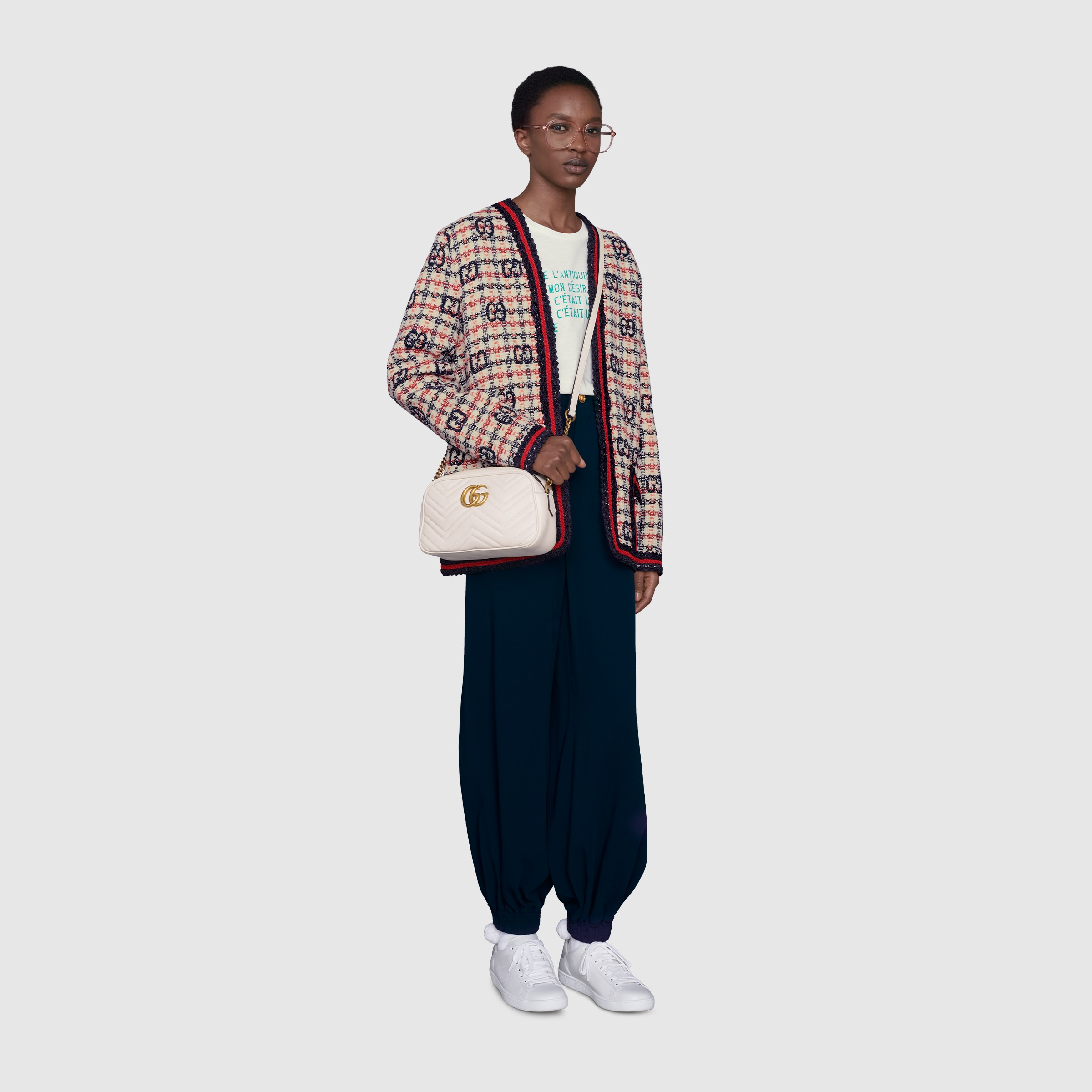 ソフトなストラクチャードシェイプが特徴的なスモールサイズの〔GGマーモント〕 チェーンショルダーバッグ。ジップトップ クロージャーにダブルG ハードウェアがあしらわれています。チェーン ショルダーストラップには、レザーのショルダー ディテールが飾られています。バックのGGが印象的なシェブロン デザインのキルティングレザー製です。