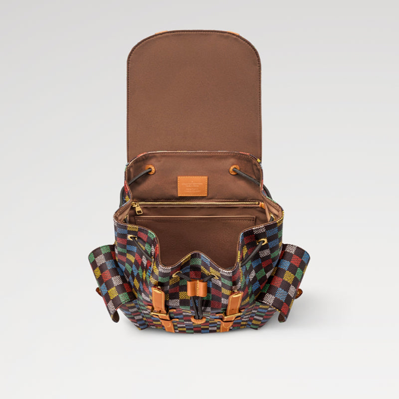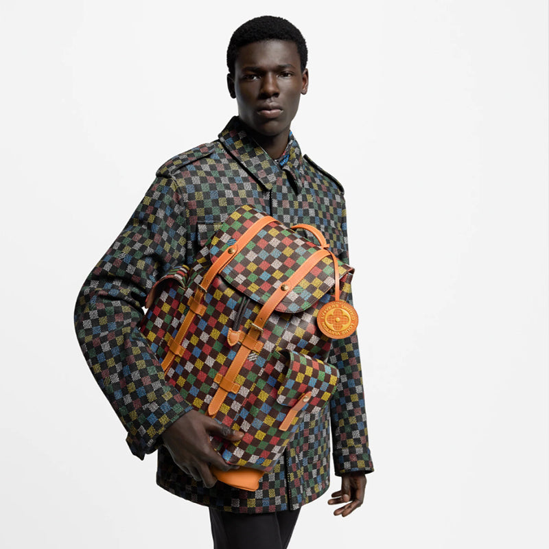 クリストファー ミディアム バックパックは、LVers ダミエ・エベヌ キャンバスを使用し、様々な国旗をあしらったカラフルなチェック柄が特徴です。これは、ファレル・ウィリアムスがこのコレクションで選んだ「団結と結束」の精神を反映しています。「LVERS UNITED」の刻印が入ったボール型のタグが付いています。
