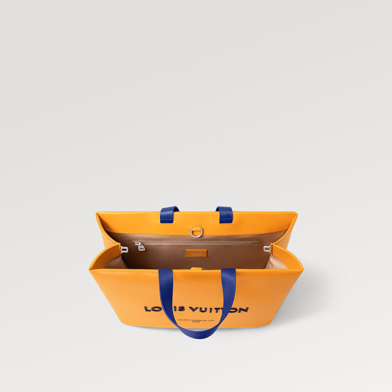ルイ・ヴィトンのショッピングバッグから着想を得て、サフランカラーのカウハイドレザーで仕立てた「ショッパー・トート MM」。驚くほど柔らかな手触りのスムースレザーと、正面には「Louis Vuitton」と「Maison Fondée En 1854」の文字が特徴です。2本のトップハンドルと取外し可能なストラップで、ショルダーキャリーでも楽しめます。