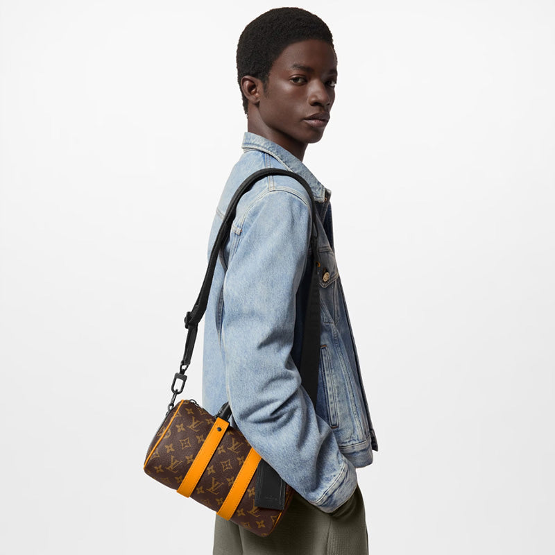 - このキーポル バンドリエール 25 ハンドバッグは、モノグラム マカッサ コーティング キャンバスで作られており、コントラストのあるレザーのサイドストラップが目を引く色を添えています。ハンドルループの下の金属製リベットはマットな質感で、ルイ・ヴィトンのロゴがあしらわれた幅広の布製ショルダーストラップは肩掛けや斜めがけにも便利です。